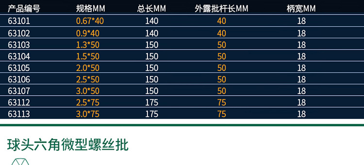 モデル 63101 六角マイクロプラスチックハンドルドライバー 0.67x40mm*1*1,63102 六角マイクロプラスチックハンドルドライバー 0.9x40mm*1*1,63103 六角マイクロプラスチックハンドルドライバー 1.3x40mm*1*1,63104 六角マイクロプラスチックハンドルドライバー 1.5x40mm*1*1,63105 六角マイクロプラスチックハンドルドライバー 2.0x40mm*1*1,63106 六角マイクロプラスチックハンドルドライバー 2.5x40mm*1*1,63107 六角マイクロプラスチックハンドルドライバー 3.0x40mm*1*1,63113 六角マイクロプラスチックハンドルドライバー 3.0x60mm*1*1,63201 球六角マイクロプラスチックハンドルドライバー 1.3x40mm*1*1,63202 球六角マイクロプラスチックハンドルドライバー 1.5x40mm*1*1,63207 球六角マイクロプラスチックハンドルドライバー 2.0x50mm*1*1,63210 球六角マイクロプラスチックハンドルドライバー 2.5x60mm*1*1,63211 球六角マイクロプラスチックハンドルドライバー 3.0x60mm*1*1