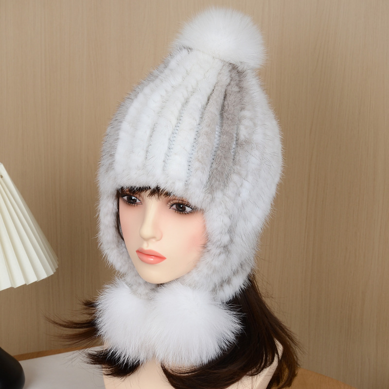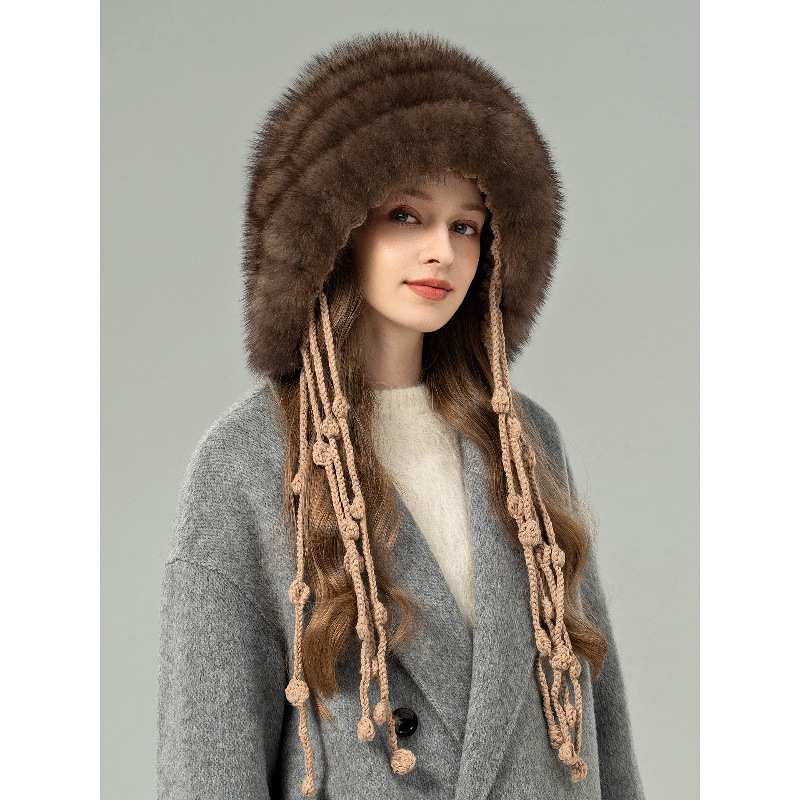 时尚水貂毛编织帽子女款冬季皮毛一体皮草护耳包头真貂绒狐狸毛球