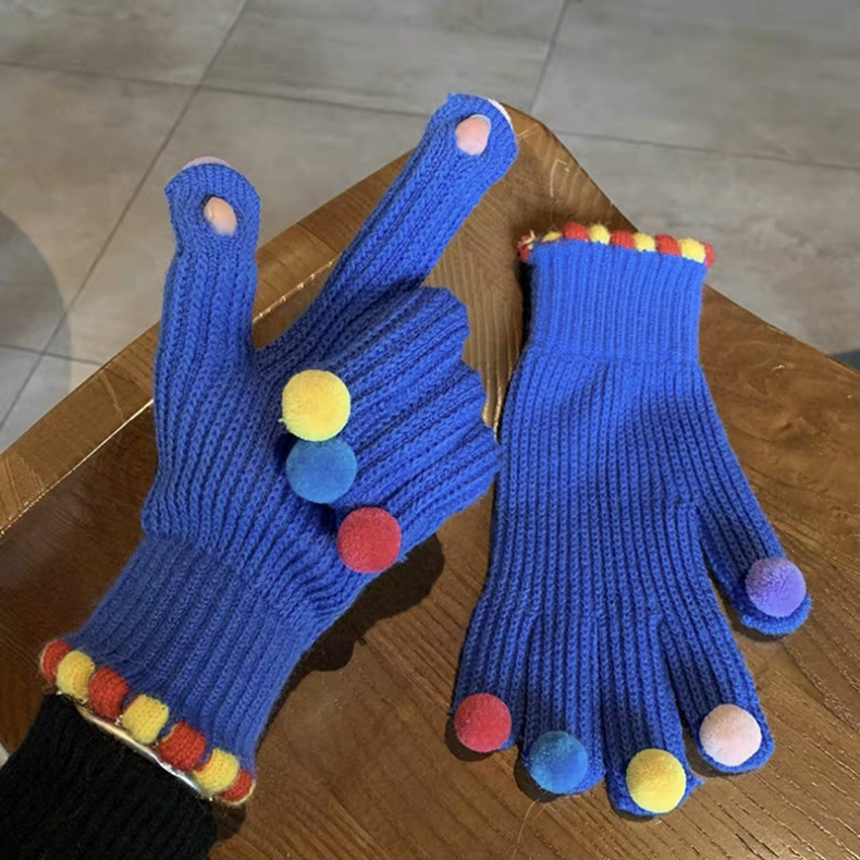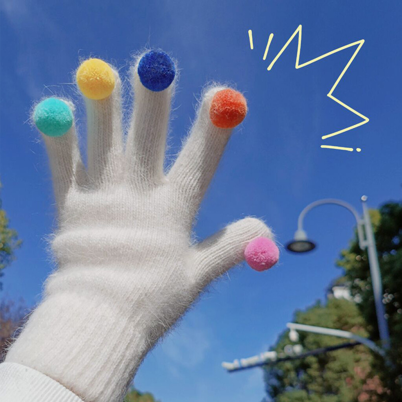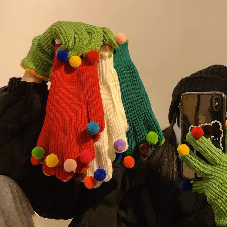 彩色球球毛线针织手套女冬季可爱小球触屏露手指头保暖五指骑车暖