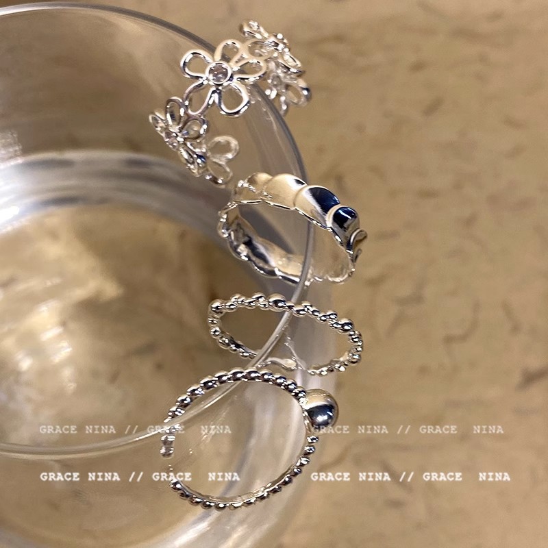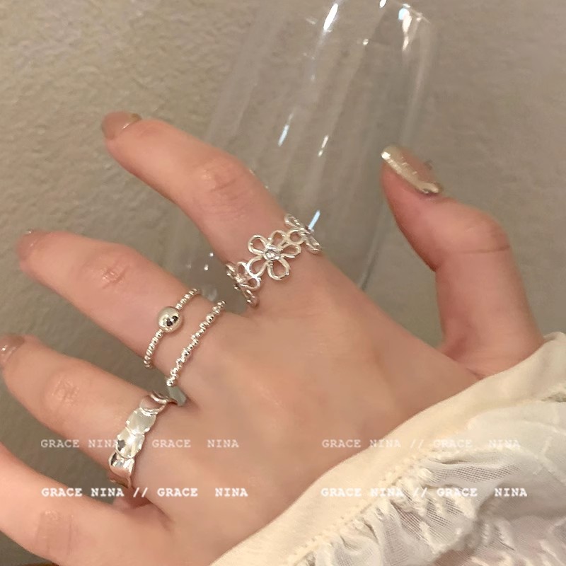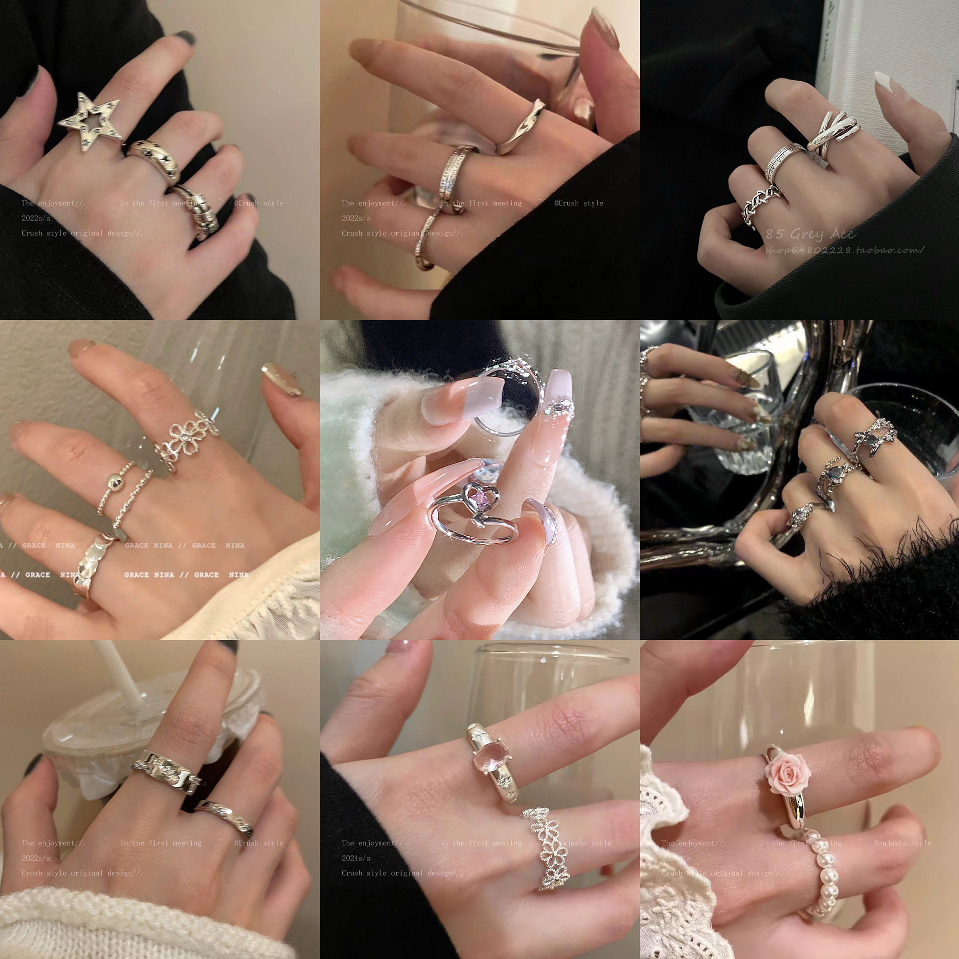 甜酷冷淡风素圈戒指套装组合女ins网红开口可调节食指戒链条指环