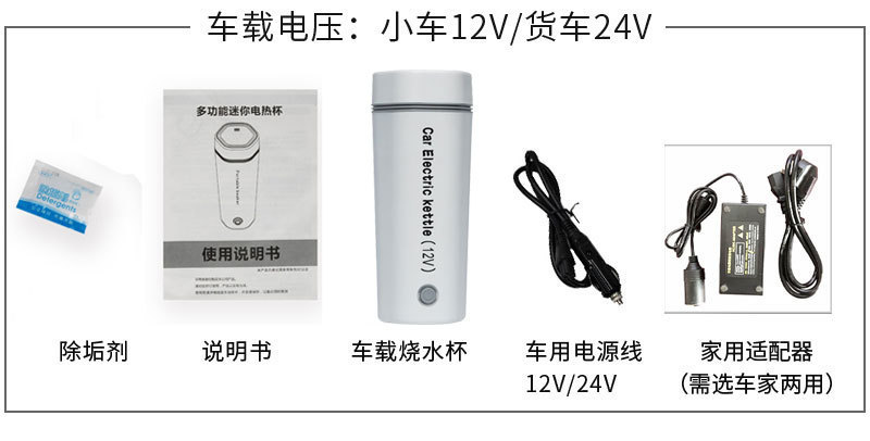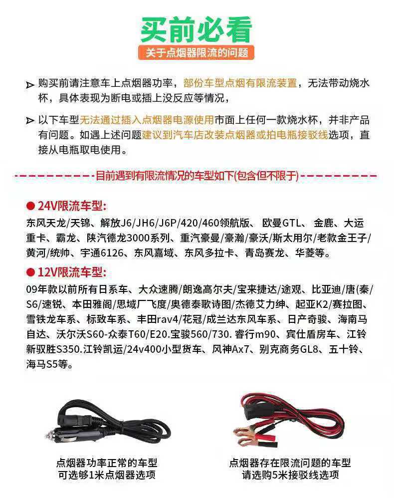 小车12V/货车24V,也可选择车家两用(带家用适配器)(适合汽车点烟器烧水)
