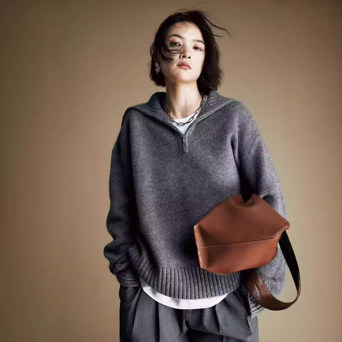 デザイン感のある灰色のセーターは秋冬に厚い大きな襟を持っています。