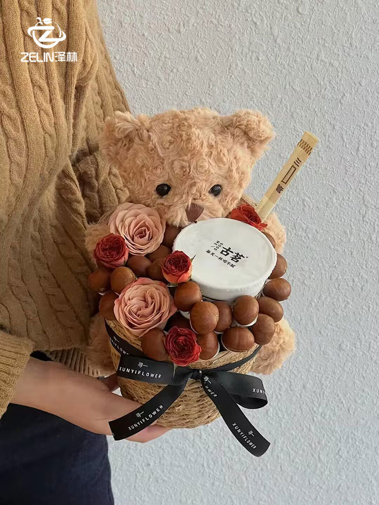 Bx小熊抱抱桶板栗花束花艺diy手工生日节日编插花花篮抱抱