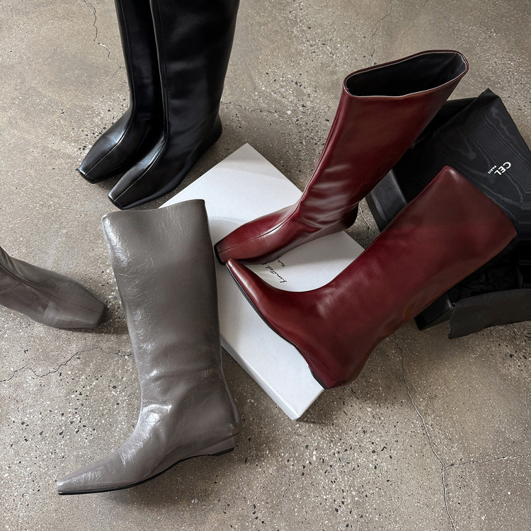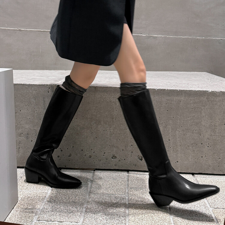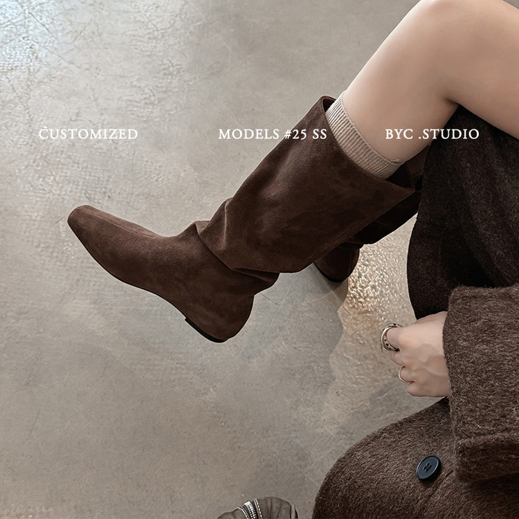 真皮方头骑士靴女直筒靴秋冬新款套筒低跟纯色不过膝靴高筒长靴女
