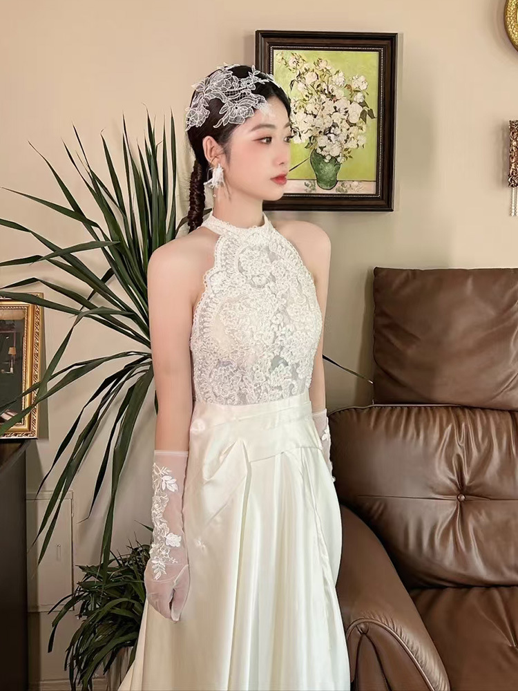 ウェディングドレス、ブライダルドレス、レトロレーススリーブ、フレンチホワイトガーゼハンドスリーブ、蝶ネクタイ付きロングスリーブ