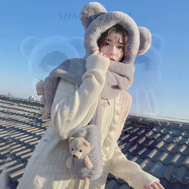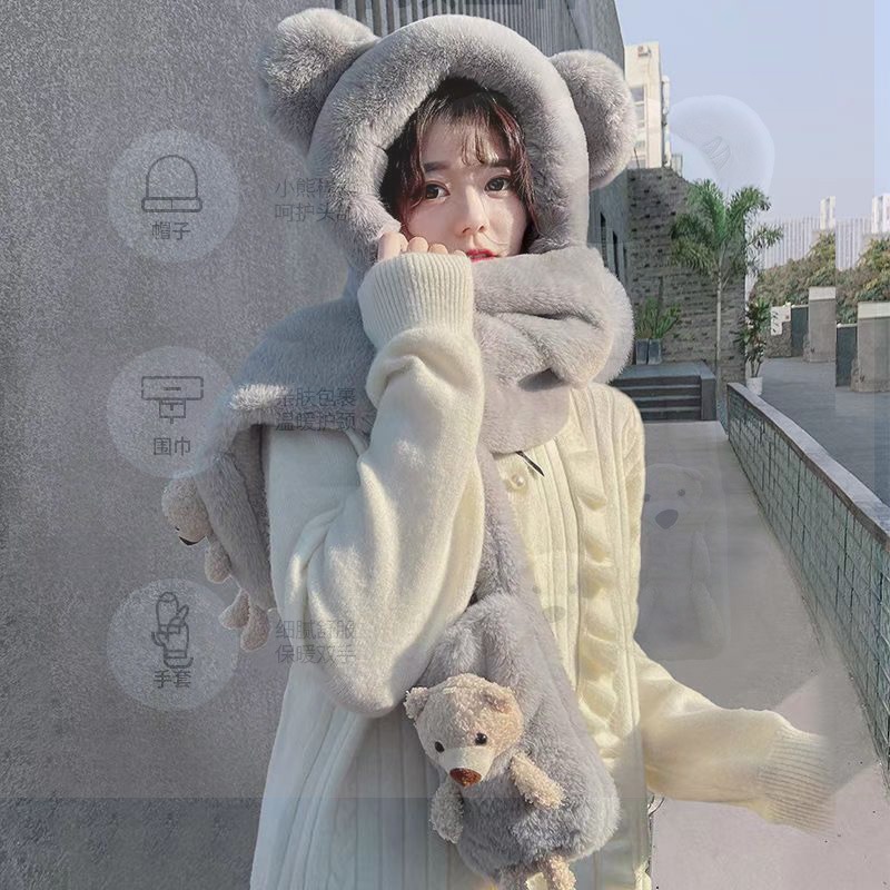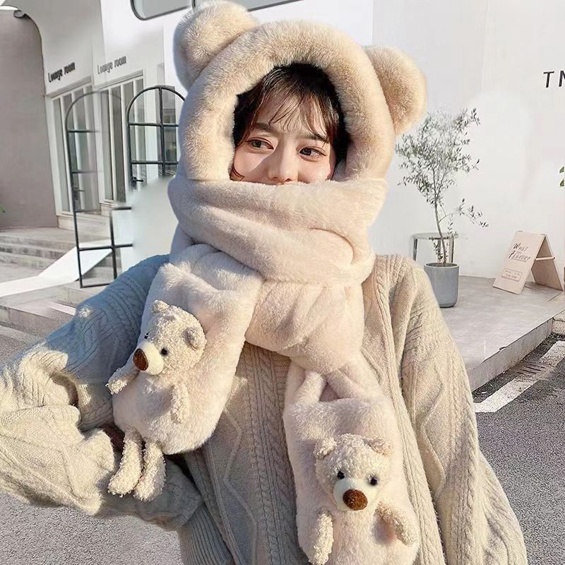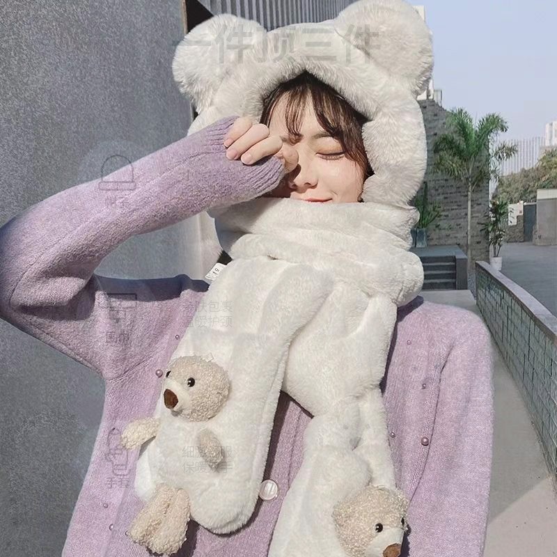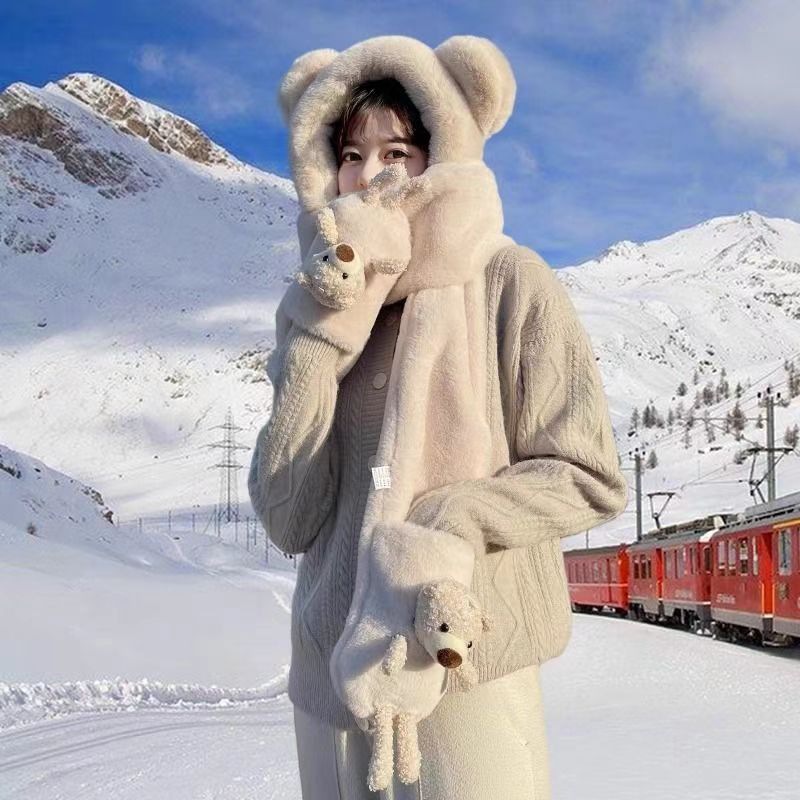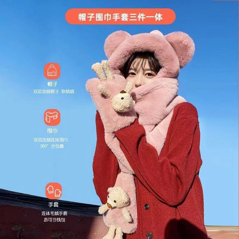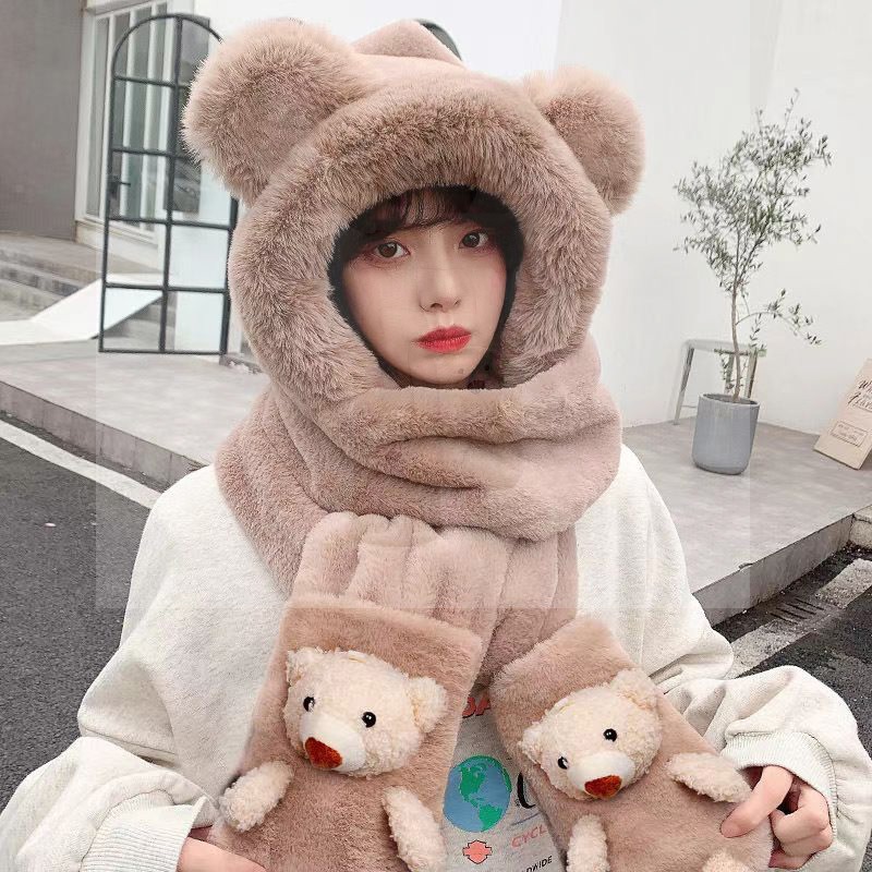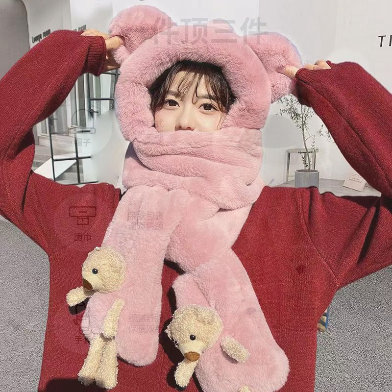 新款可爱小熊帽子围巾一体女冬季毛绒帽加厚护耳保暖三件套头连帽