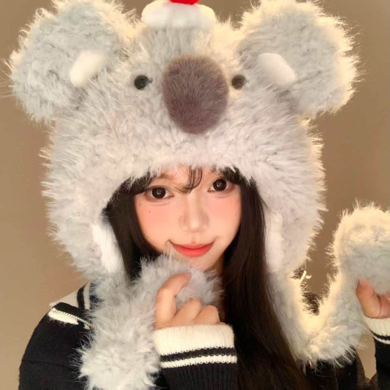 可爱考拉毛绒帽女秋冬保暖护耳帽加厚显脸小卡通雷锋帽冬季毛茸茸