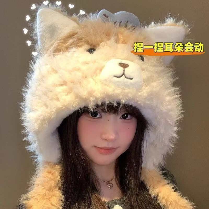 可爱卡通耳朵会动小羊加厚保暖毛帽子女冬季防寒护耳网红会动气囊