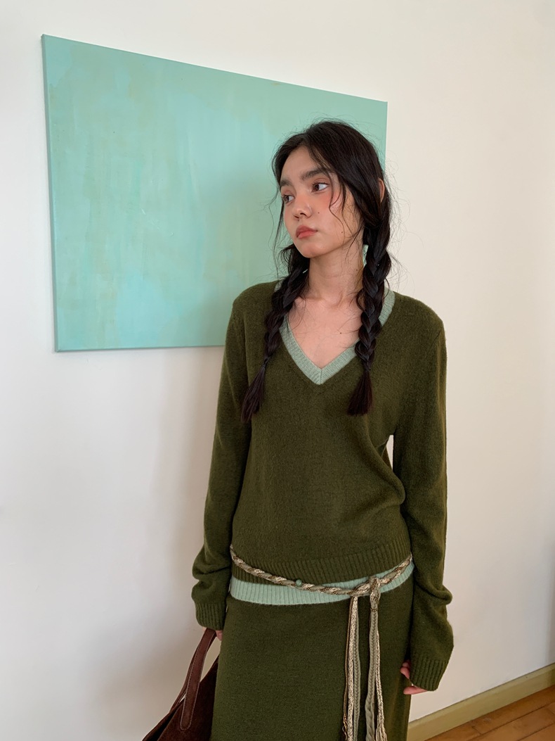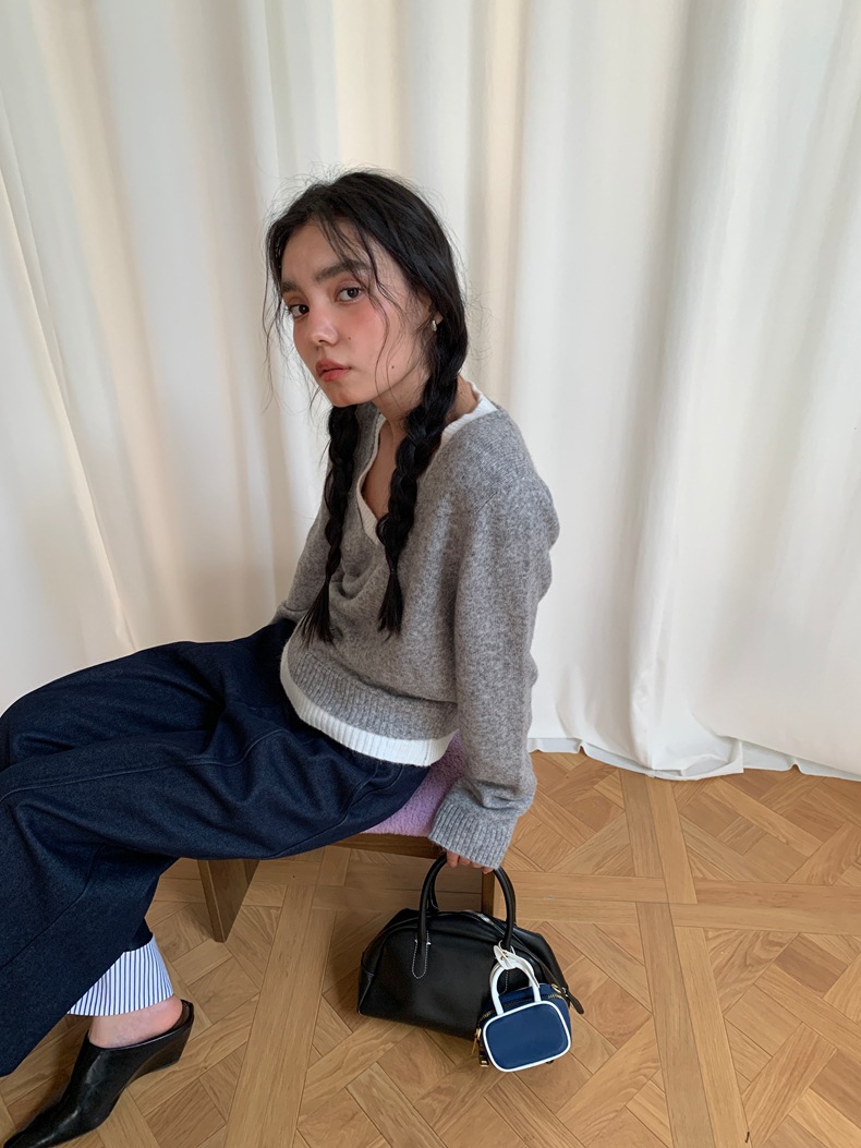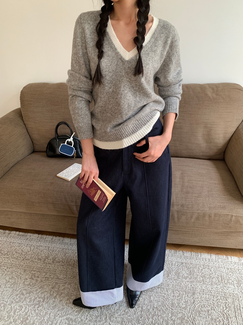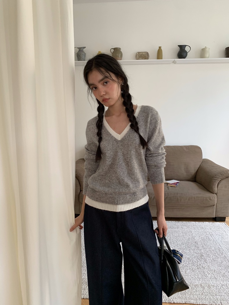 UNITY MODE miuシリーズ コントラストカラーVネックウールセーター レディース 秋冬 重ね着 グレー ニット ソフトで柔らかいトップス