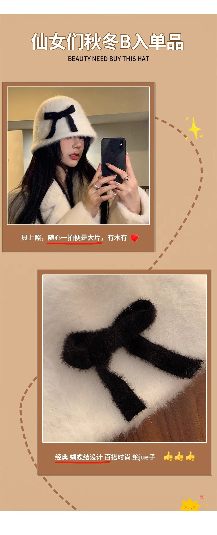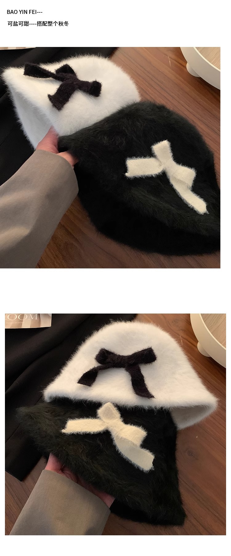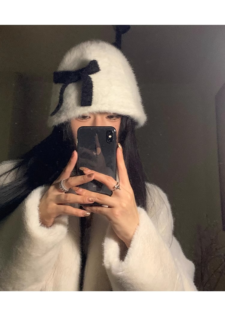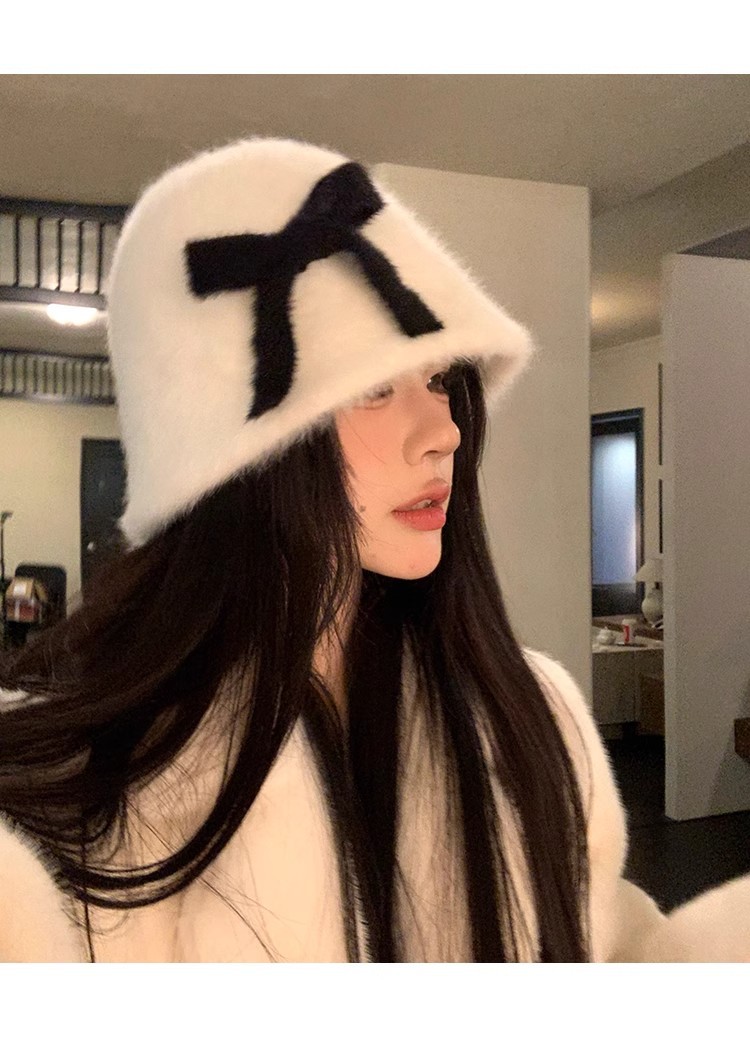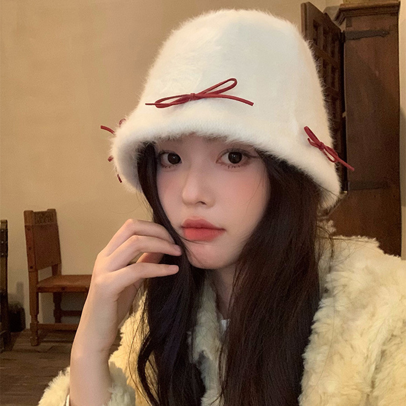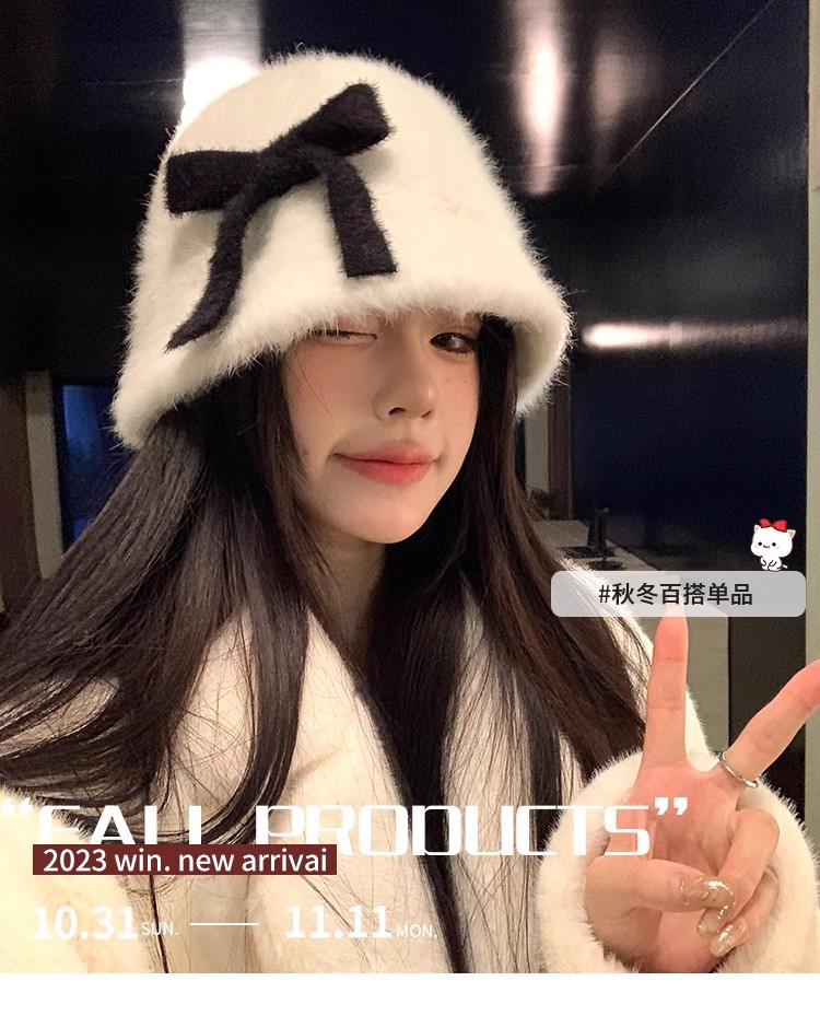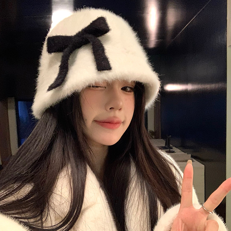 日系兔毛针织蝴蝶结毛绒渔夫帽子女秋冬保暖护耳百搭显脸小盆帽潮