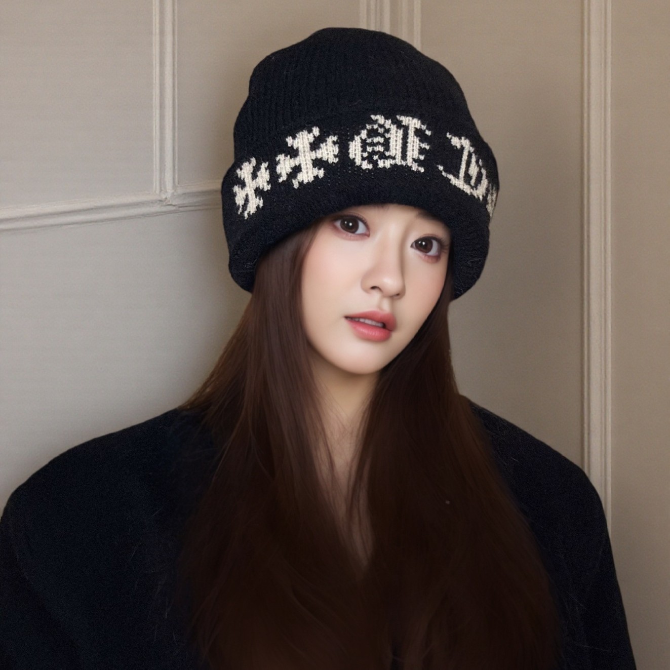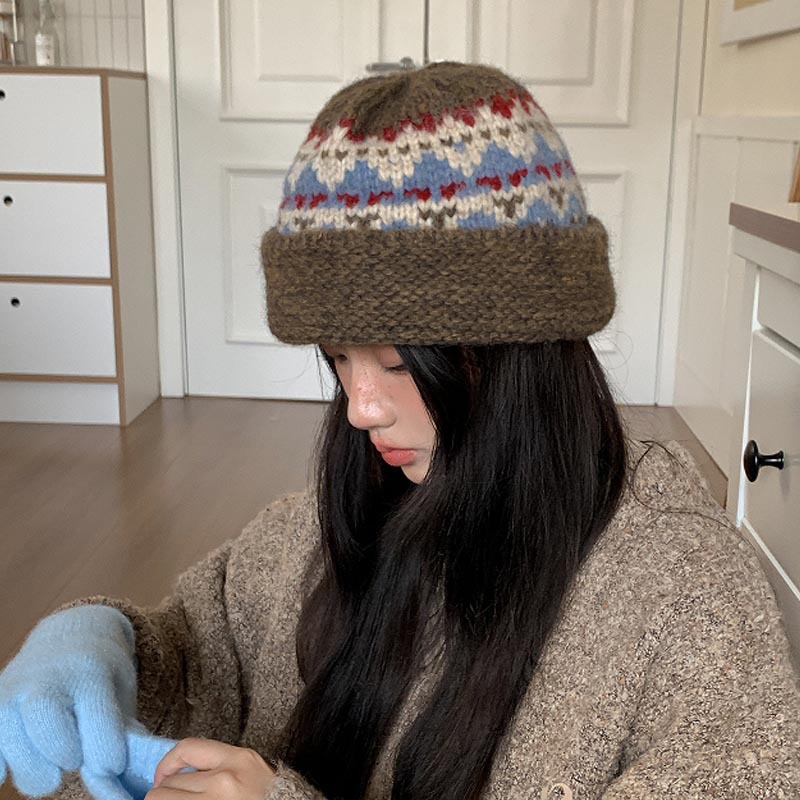 手工民族风提花针织盆帽女秋冬百搭保暖显脸小卷边加厚毛线渔夫帽
