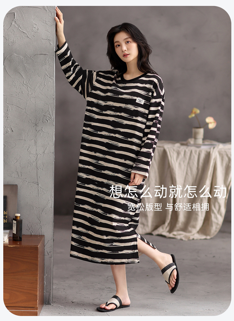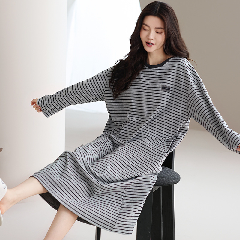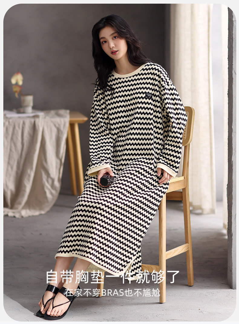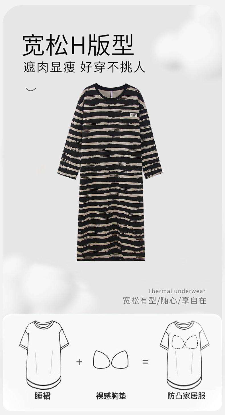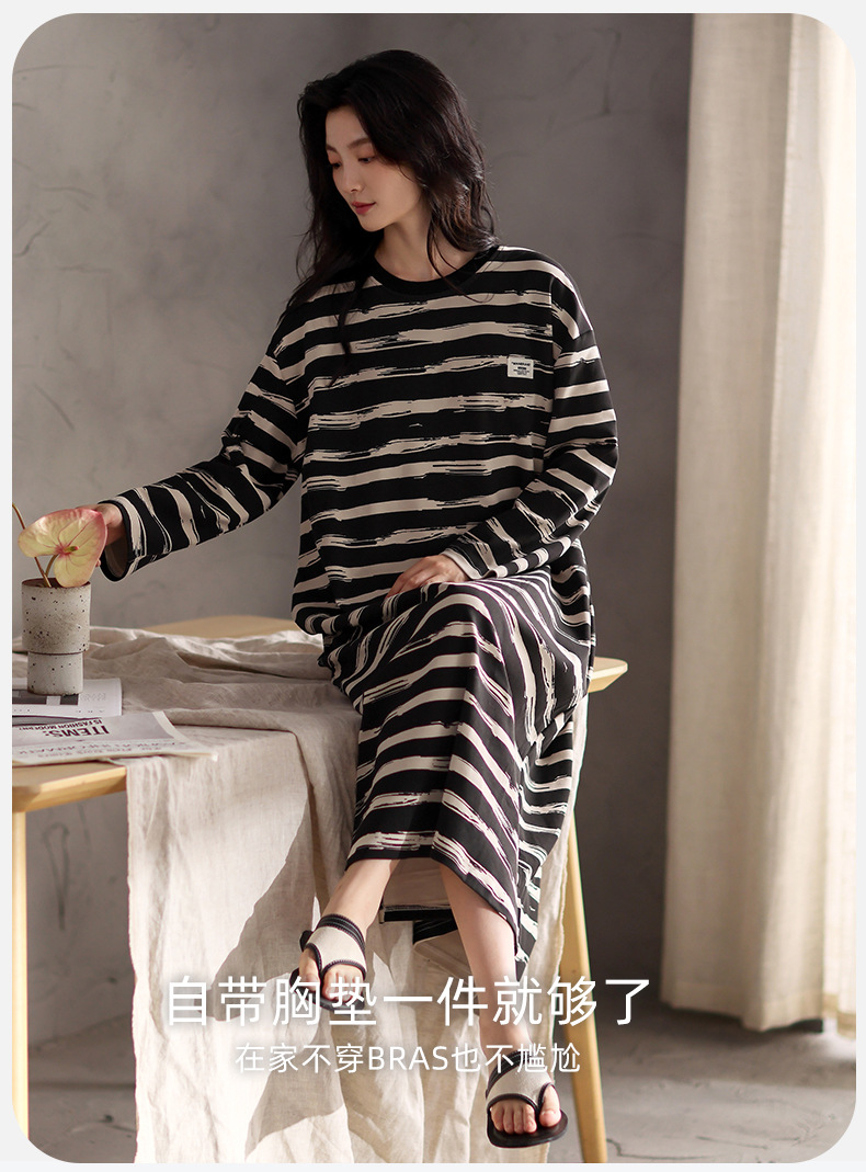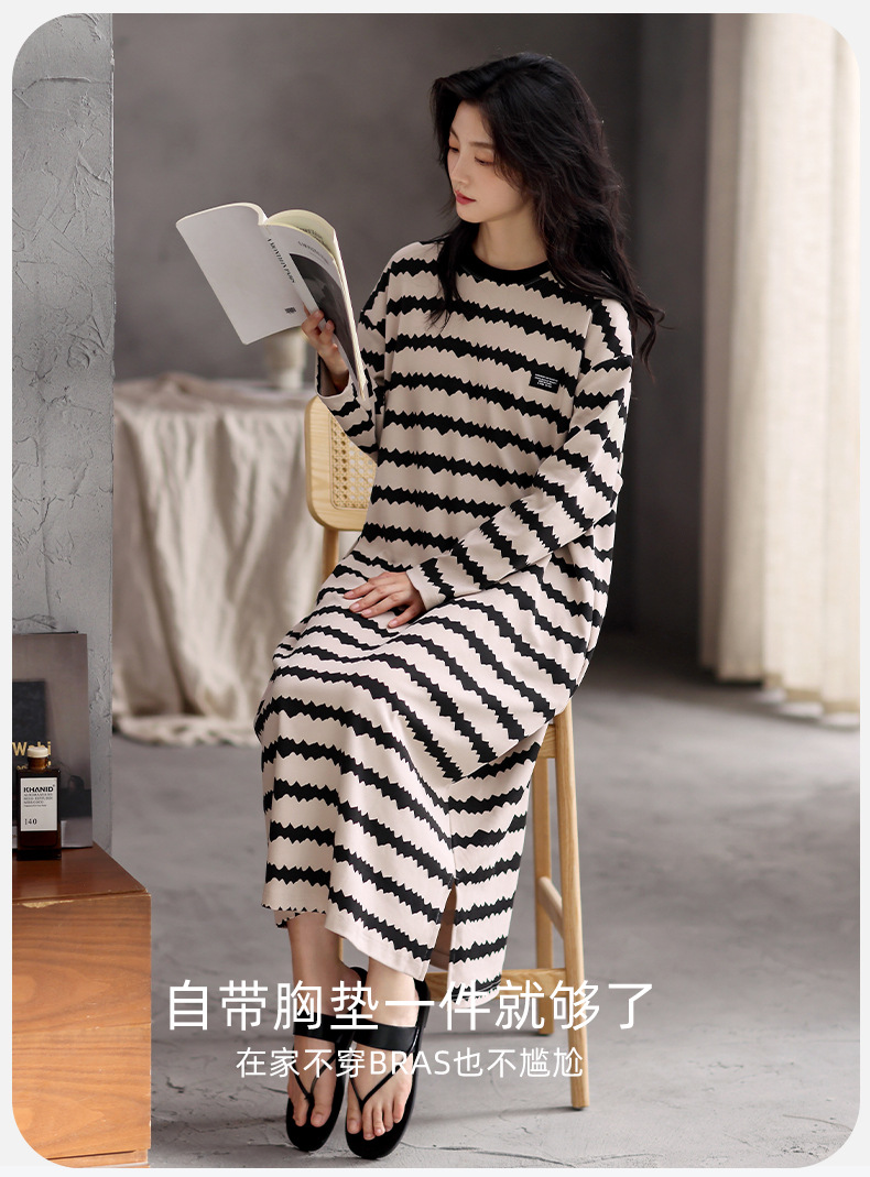 【带胸垫】睡裙女春秋季秋款棉质长袖时尚条纹睡衣大码家居服