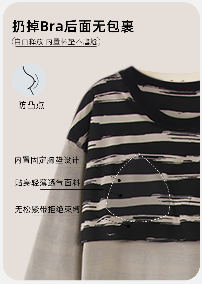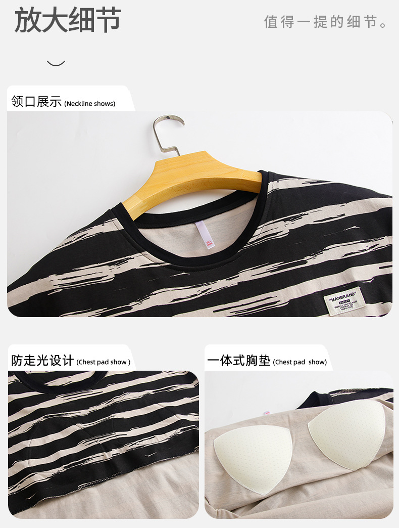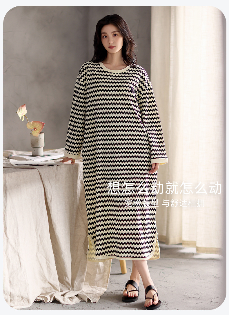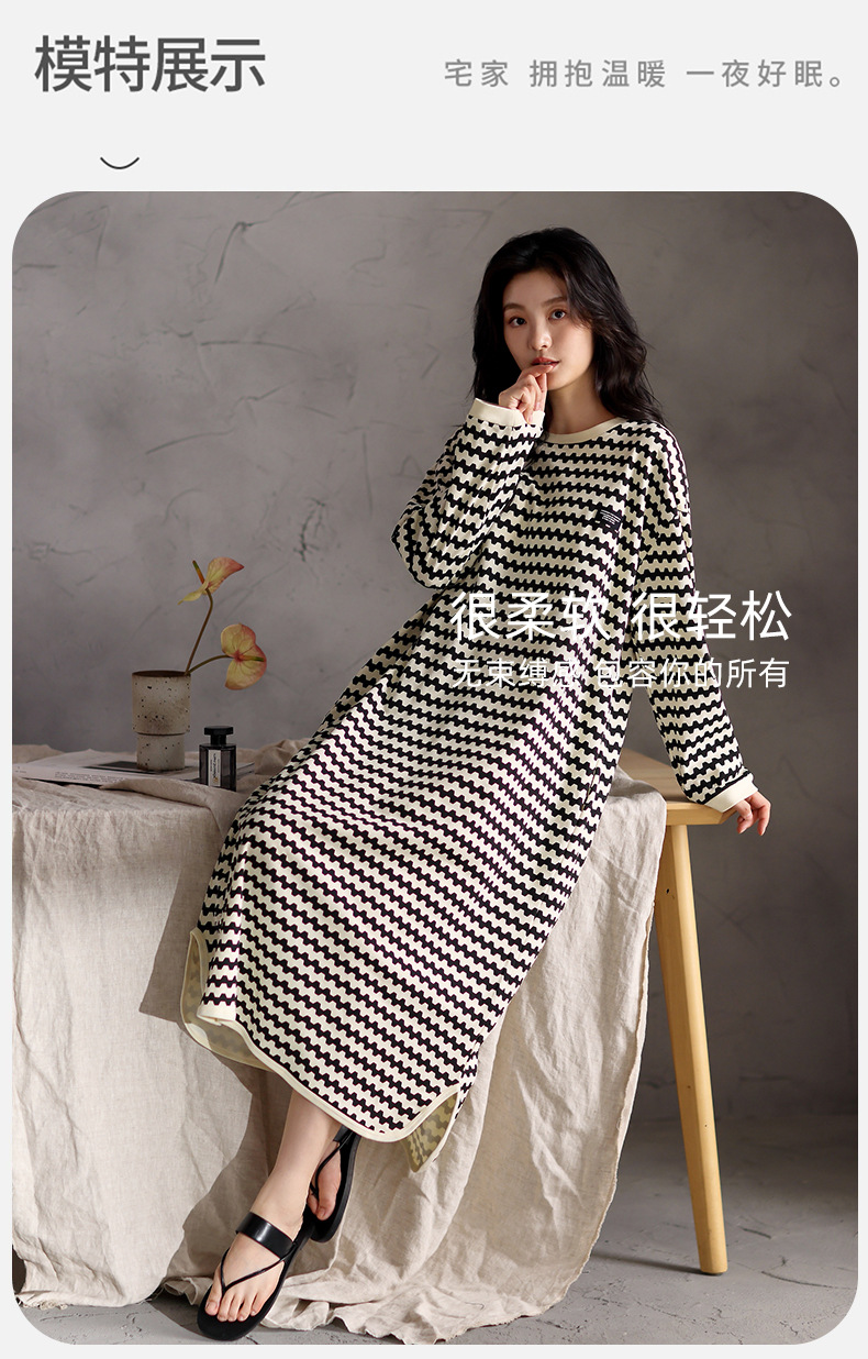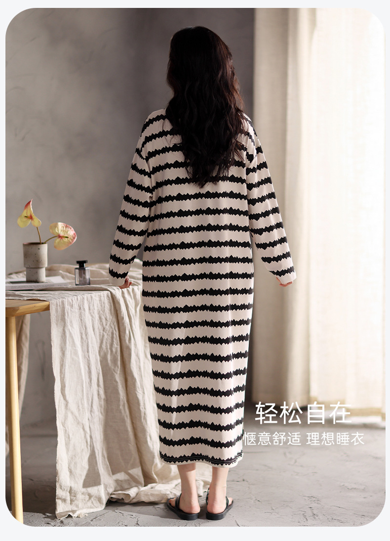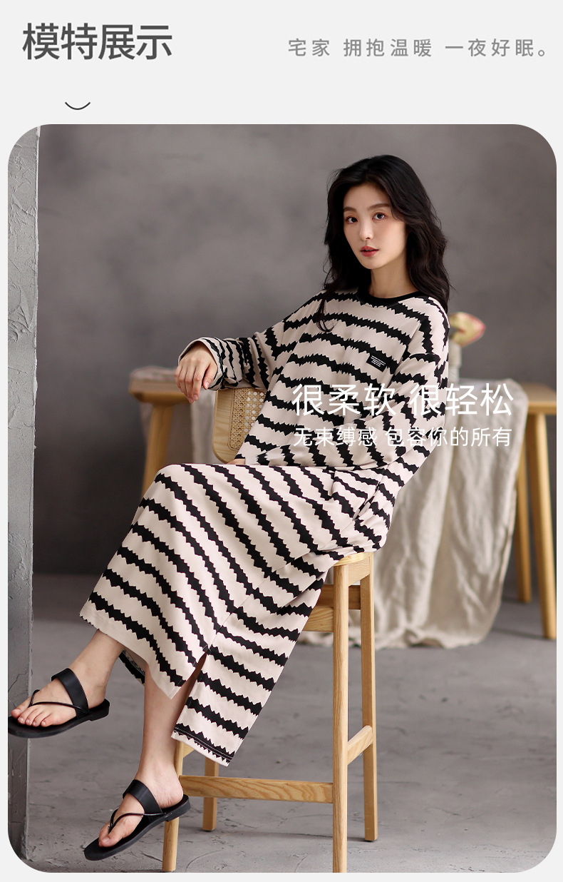 【带胸垫】睡裙女春秋季秋款棉质长袖时尚条纹睡衣大码家居服