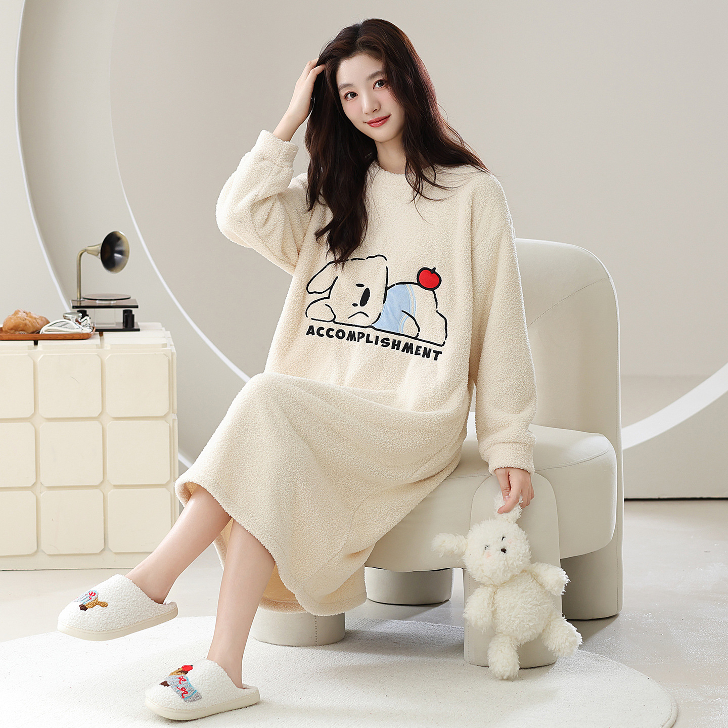 睡裙女秋冬加厚加绒半边绒圆领卡通少女连体裙软绵绵家居服可外穿