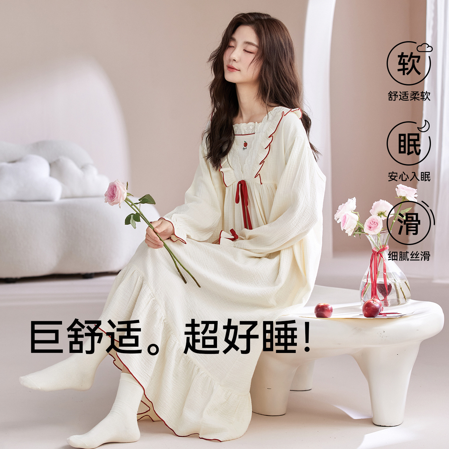 纯棉纱布睡裙女春秋季长袖薄款卡通甜美家居服长款连衣裙圆领套头