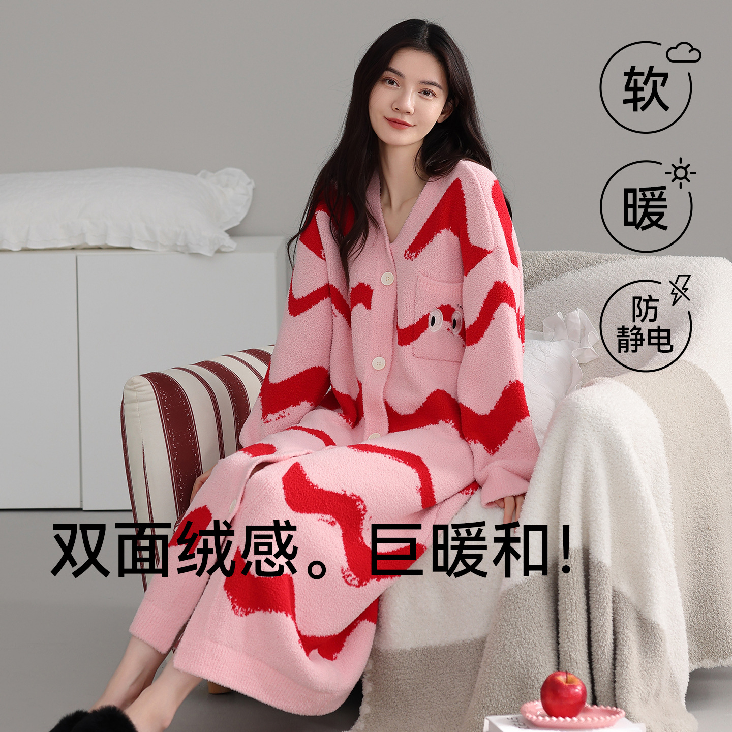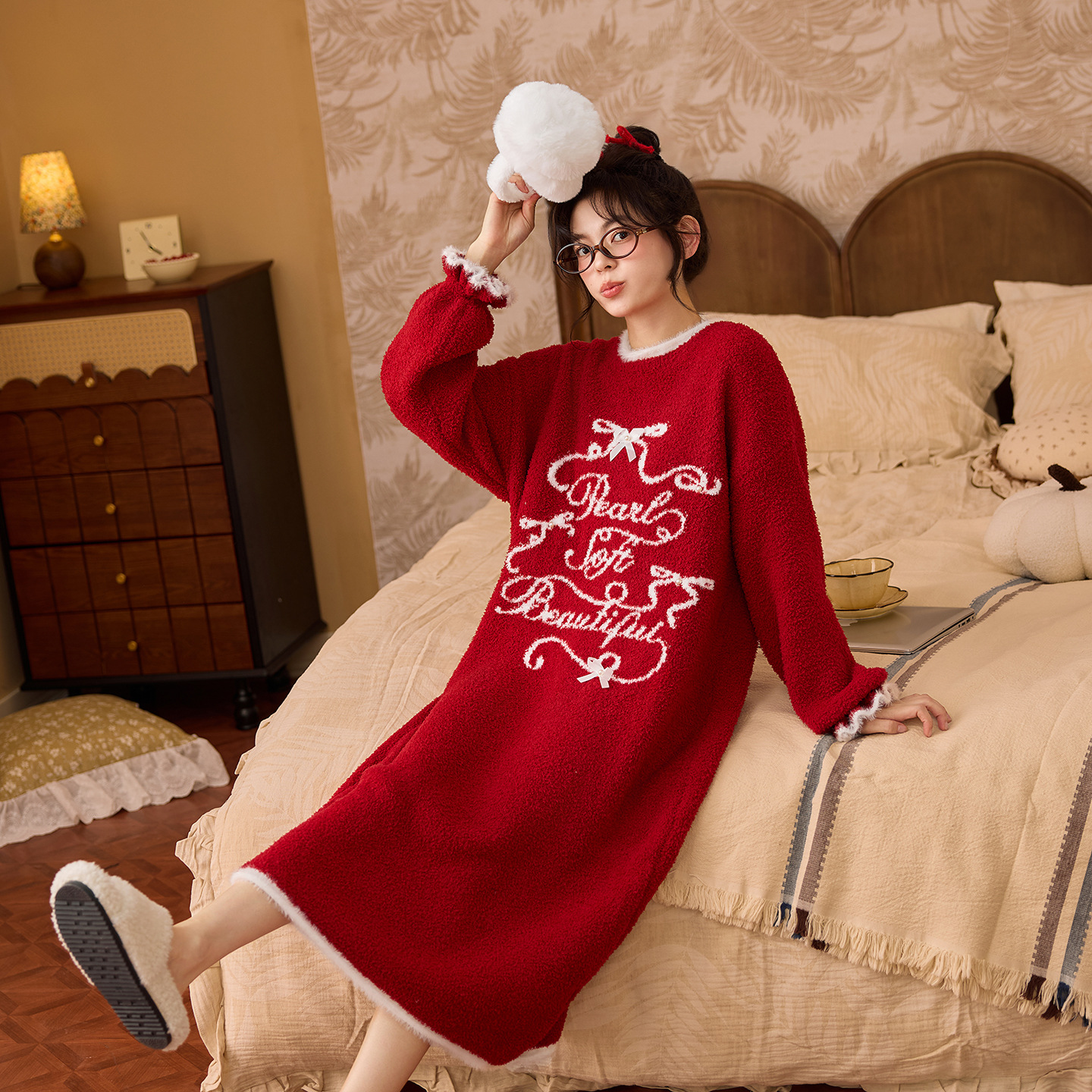 2025新款半边绒睡裙女秋冬加厚保暖可爱印花大红毛绒家居服长裙