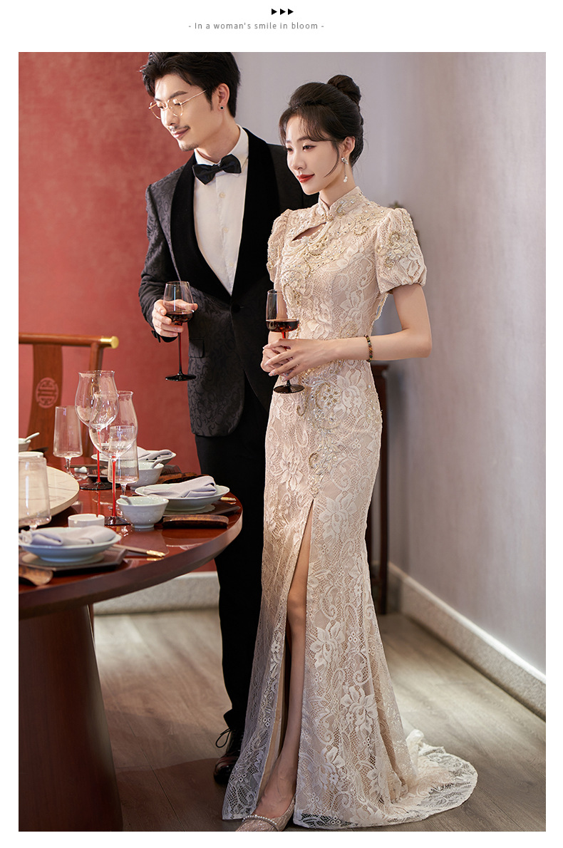新しい中国風の婚約ドレス 2025 新しいシャンパンカラーレースチャイナドレス改良されたドレッシングガウンドレスは女性が通常着用できます