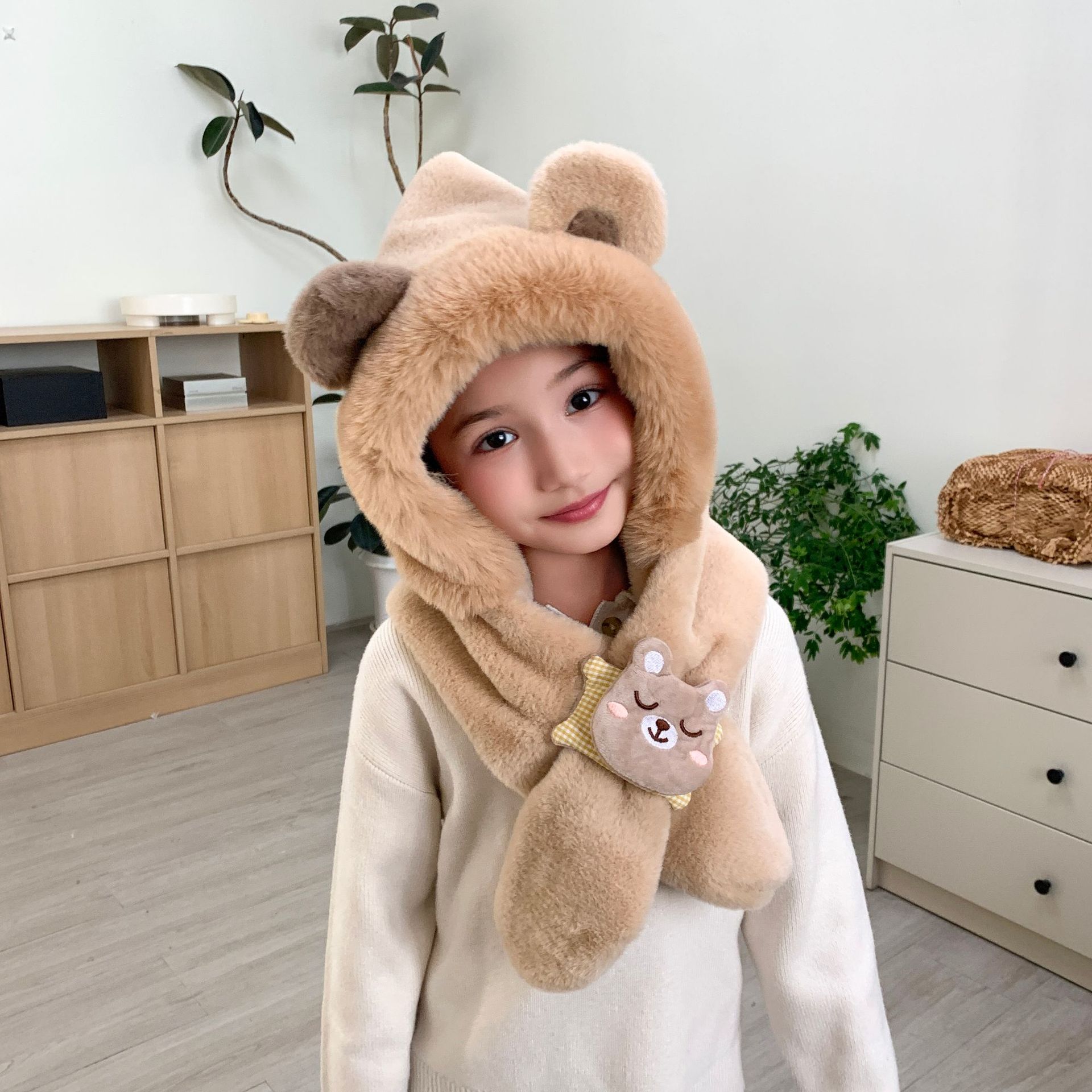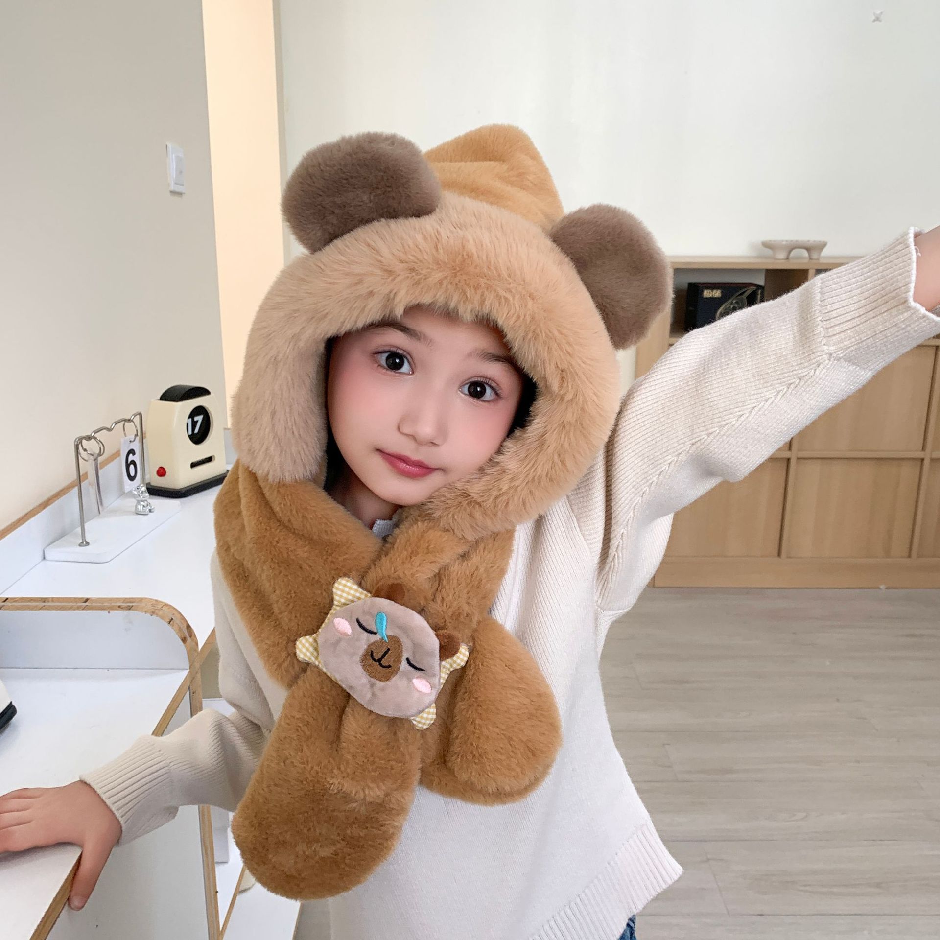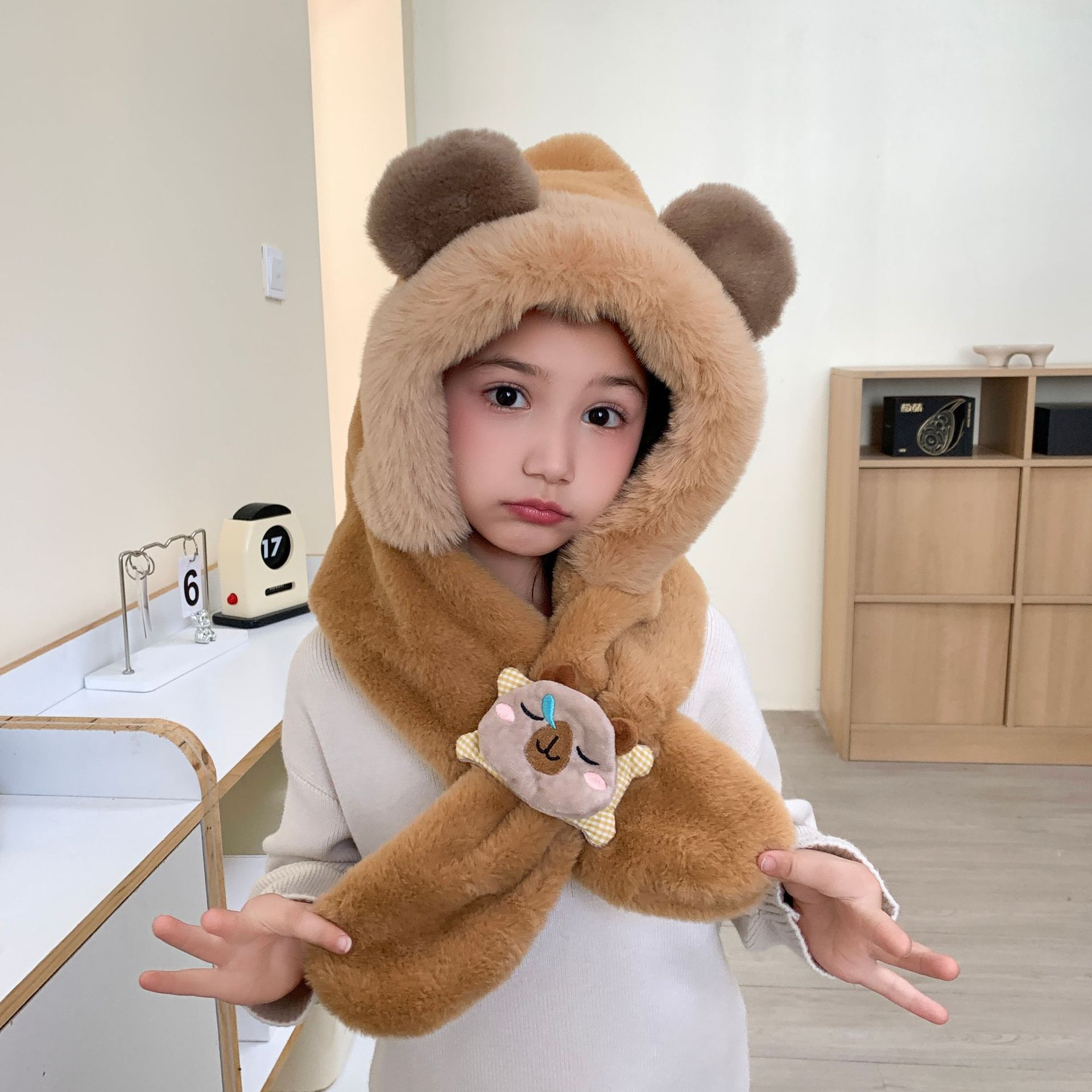 冬の男女児童一体帽子セットアニメ熊人形のぬいぐるみが首を囲んでかわいい保温快適な首を囲んでいる