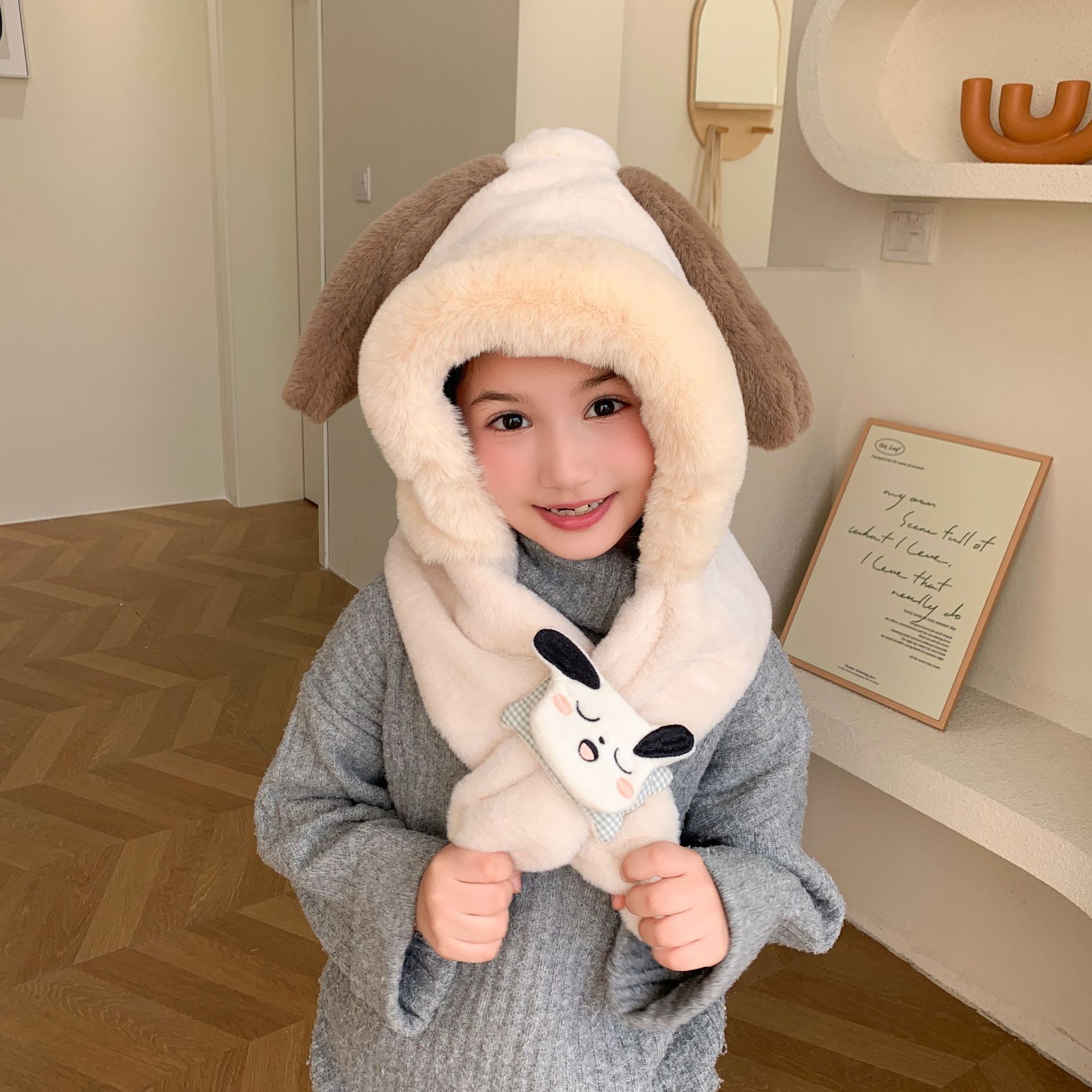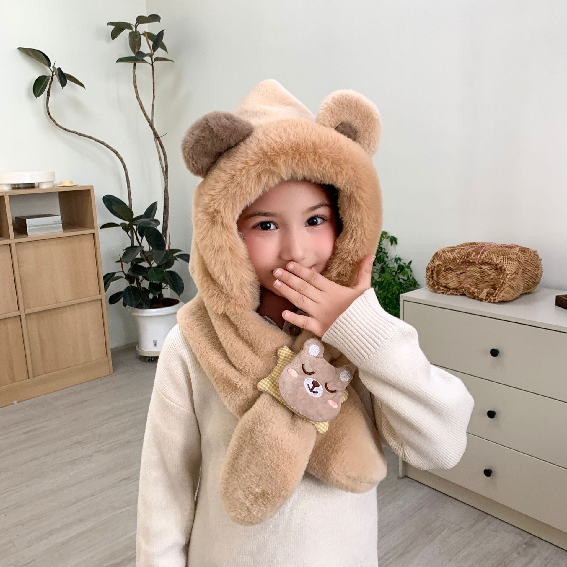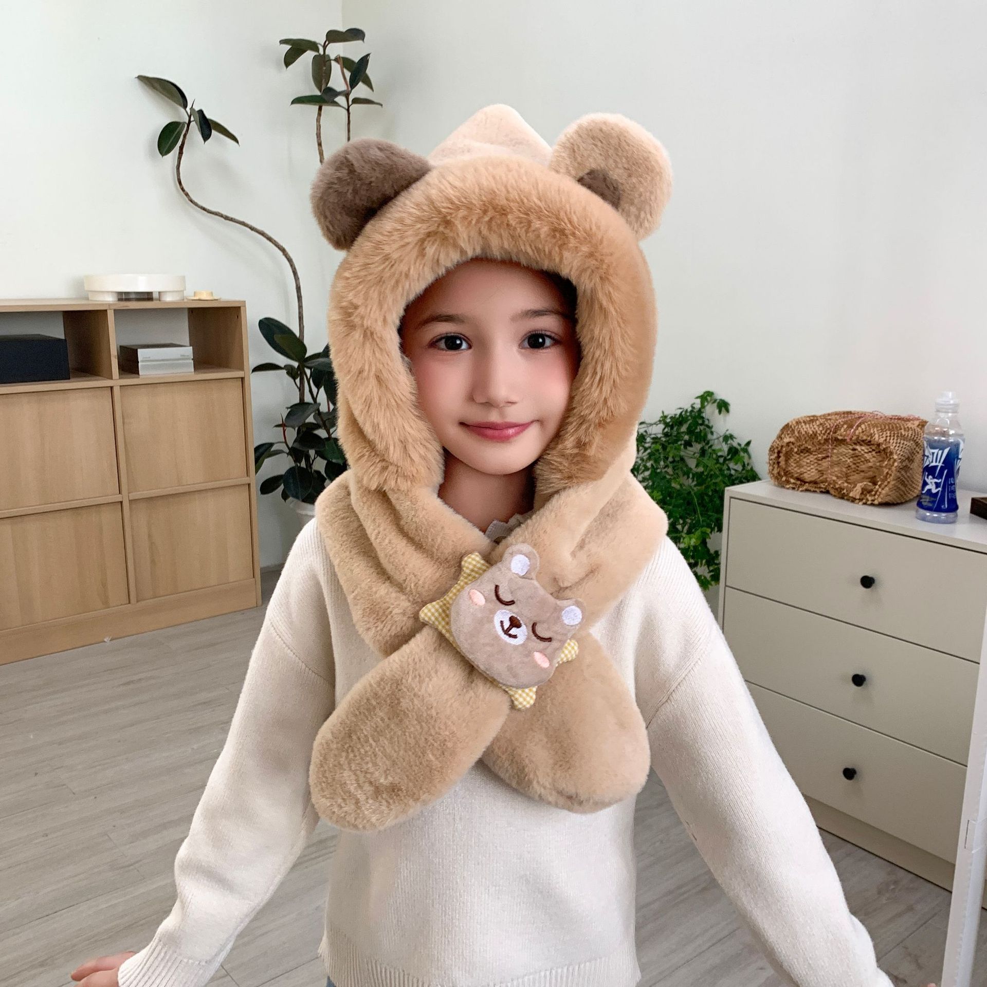 冬の男女児童一体帽子セットアニメ熊人形のぬいぐるみが首を囲んでかわいい保温快適な首を囲んでいる