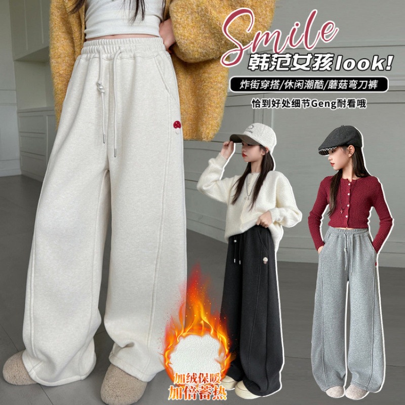 女童加绒裤冬装2025年新款秋冬季时髦中大童糯米绒刺绣蘑菇弯刀裤