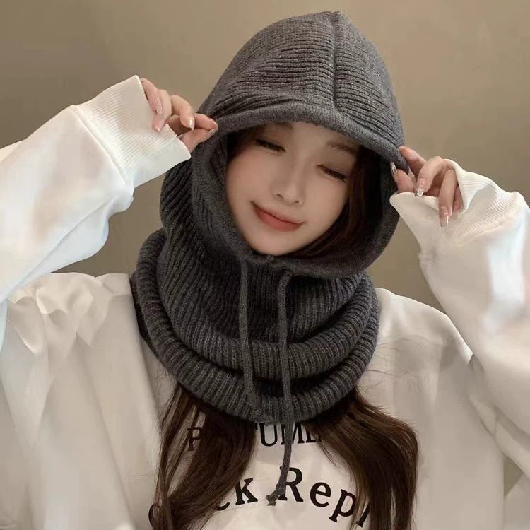 韩版帽子围脖一体新款针织护颈巴拉克拉法帽子女冬复古抽绳毛线帽