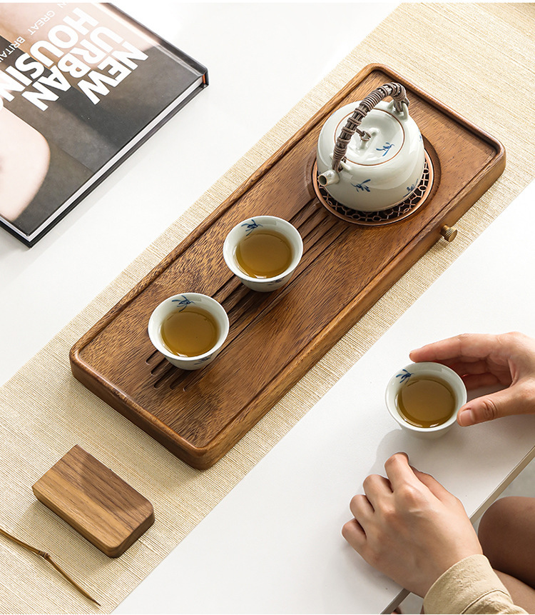 ティートレイ クルミ材 長方形木製トレイ 貯水式 無垢材 家庭用 ライト 高級 ドライバブルケトル ティーテーブルトレイ ティートレイ