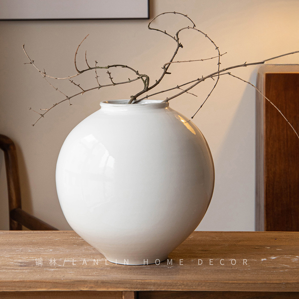 新中式白色陶瓷月亮罐花瓶插花手工圆球形粗陶摆件花艺师用插花瓶