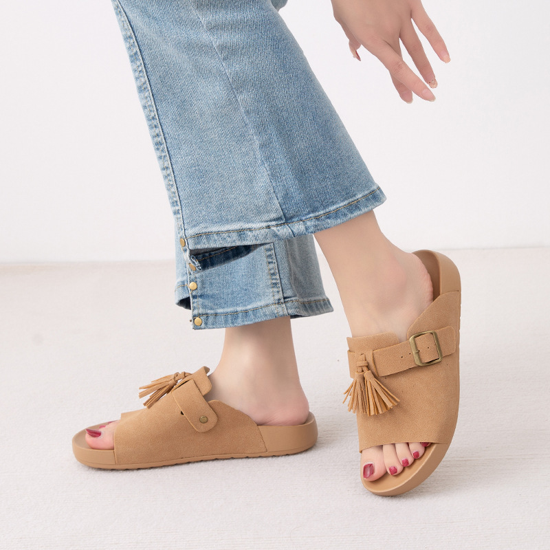 跨境金属卡扣流苏凉鞋女春季新款懒人拖鞋外穿平底舒适欧美批发