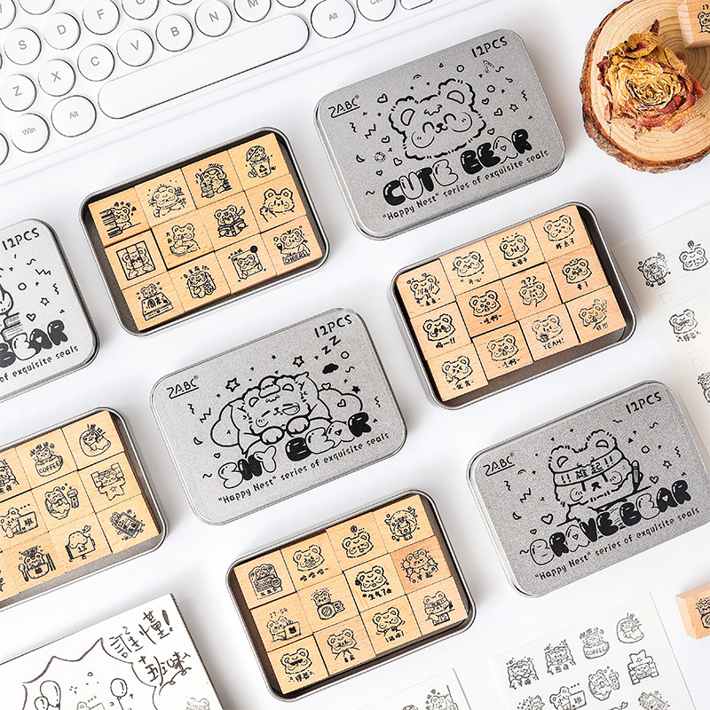 幸せな小さな巣の木製印鑑セットDIY手帳装飾素材プリントかわいいアニメ動物印鑑鉄箱