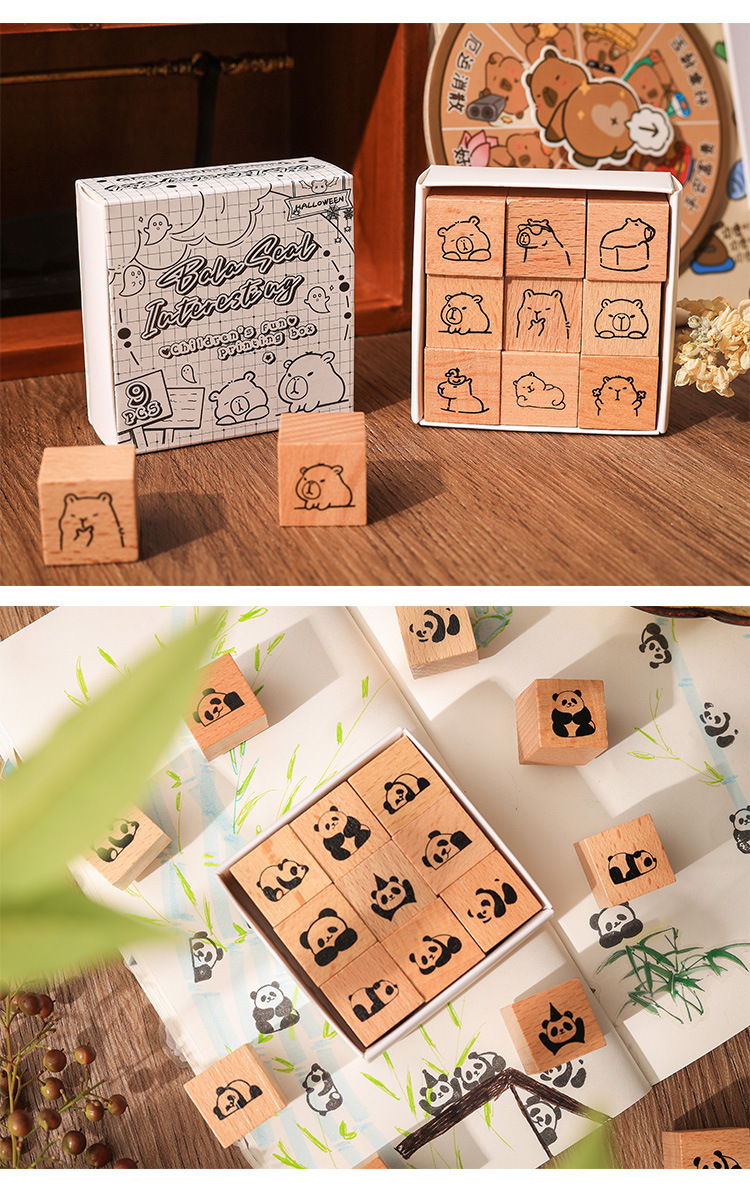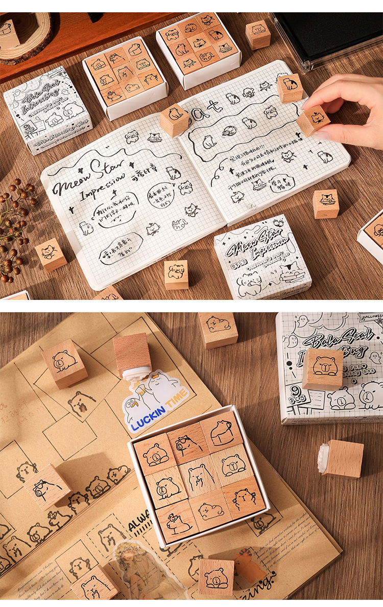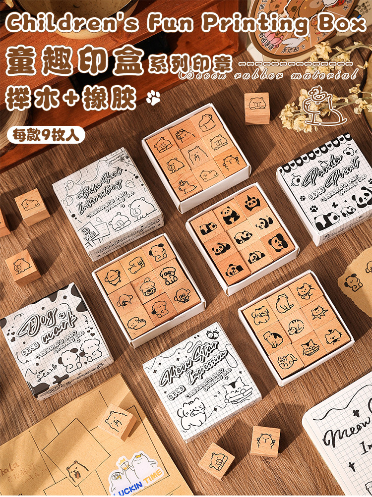 小鎮の市場の木製の漫画の印鑑のセットの箱のかわいい動物の手帳の日記の装飾の印鑑の越境のケヤキの印鑑