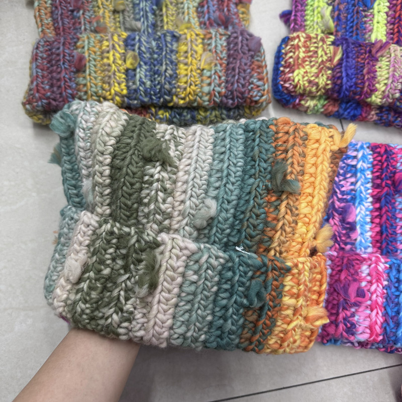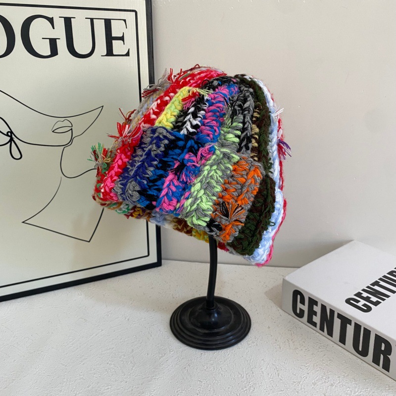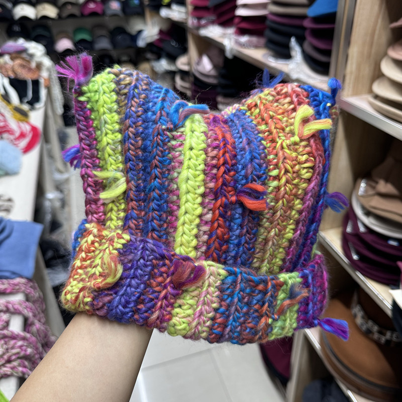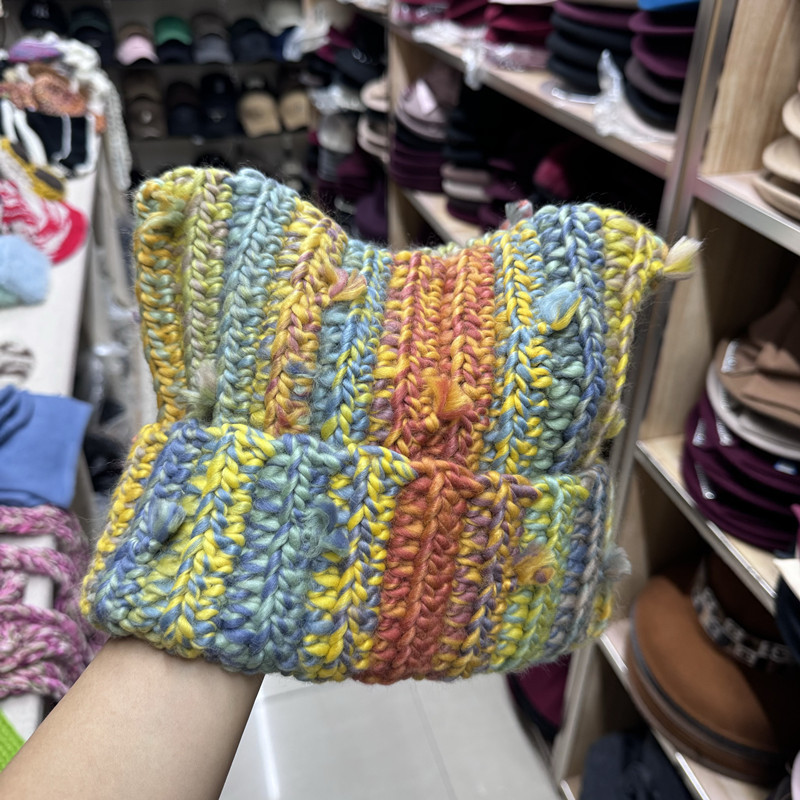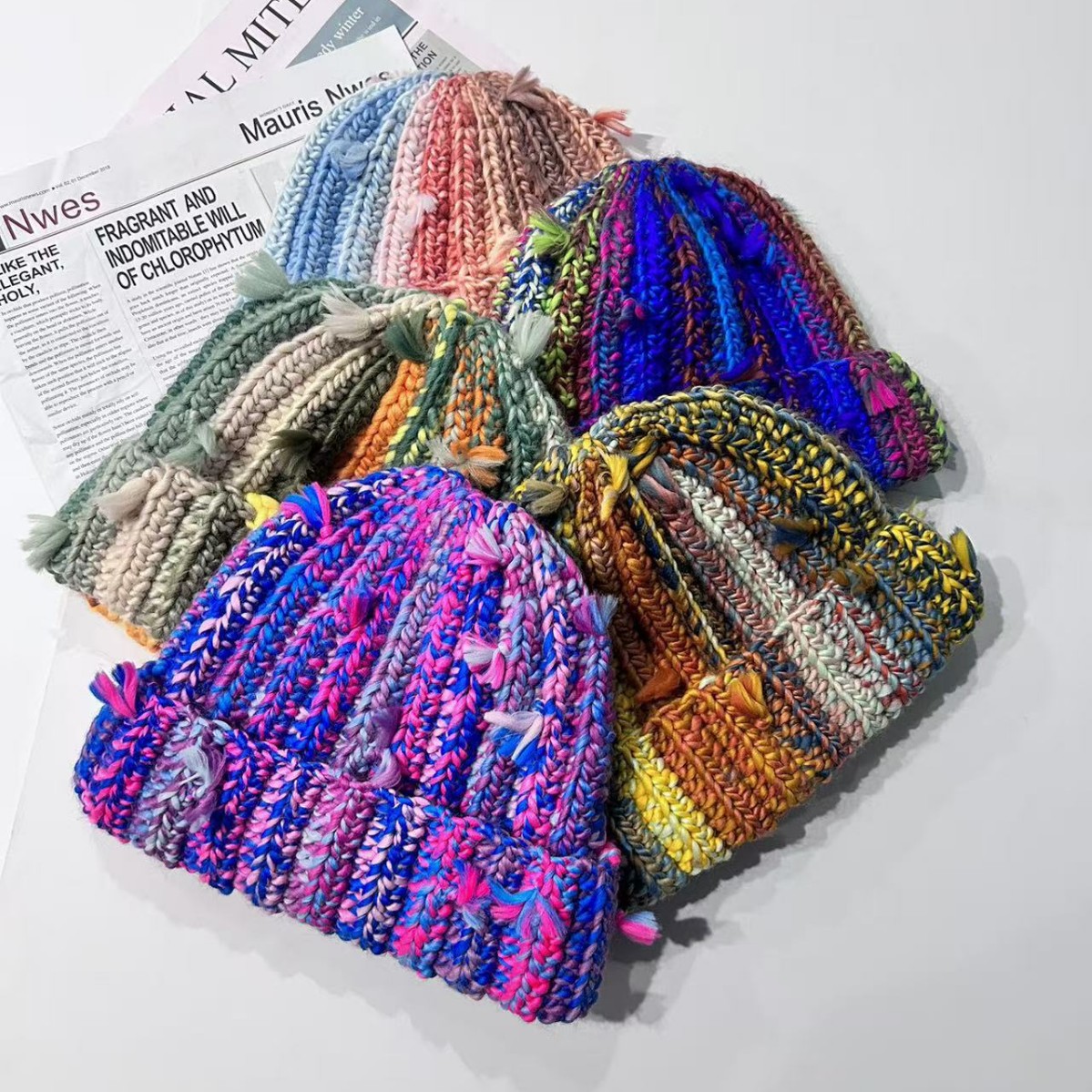 韩国小众彩虹拼色纯手工编织毛线帽女秋冬多巴胺色保暖护耳包头帽