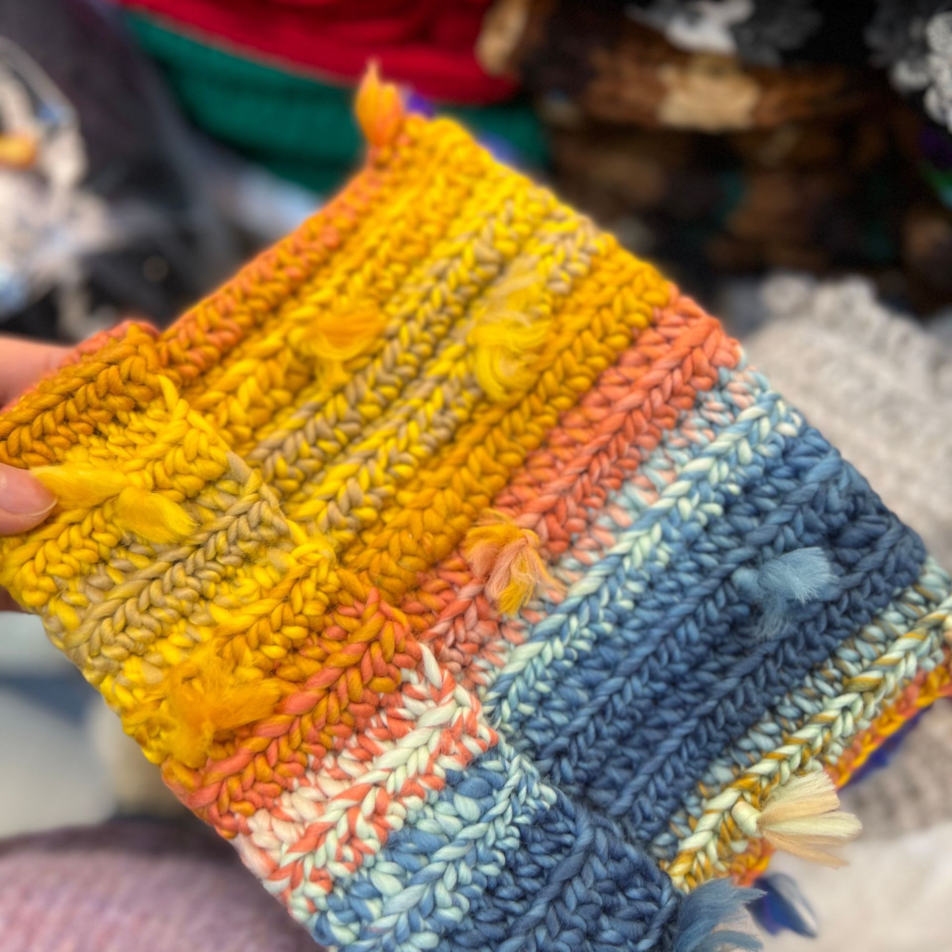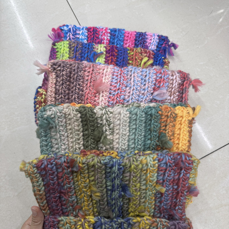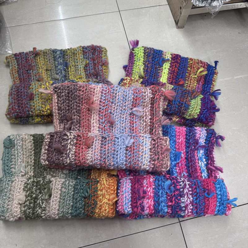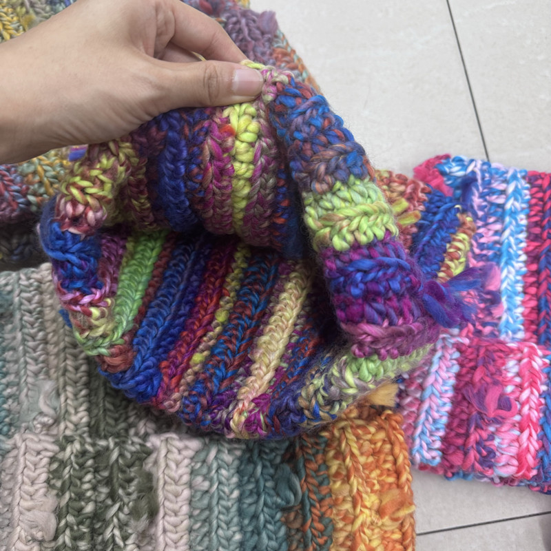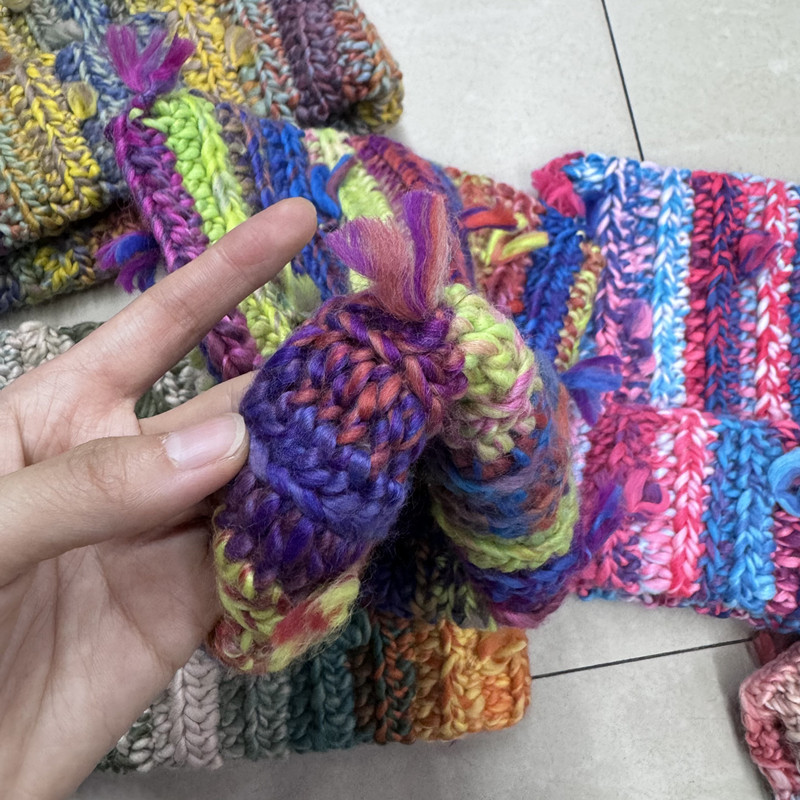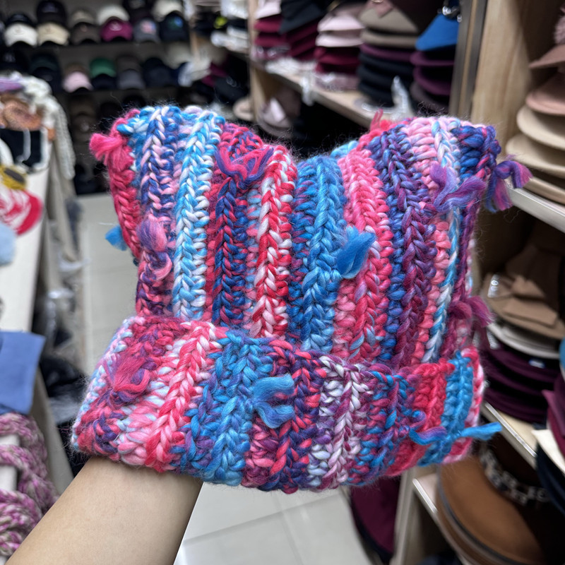 韩国小众彩虹拼色纯手工编织毛线帽女秋冬多巴胺色保暖护耳包头帽