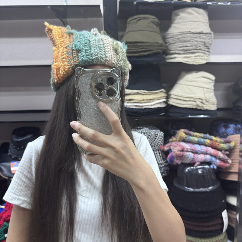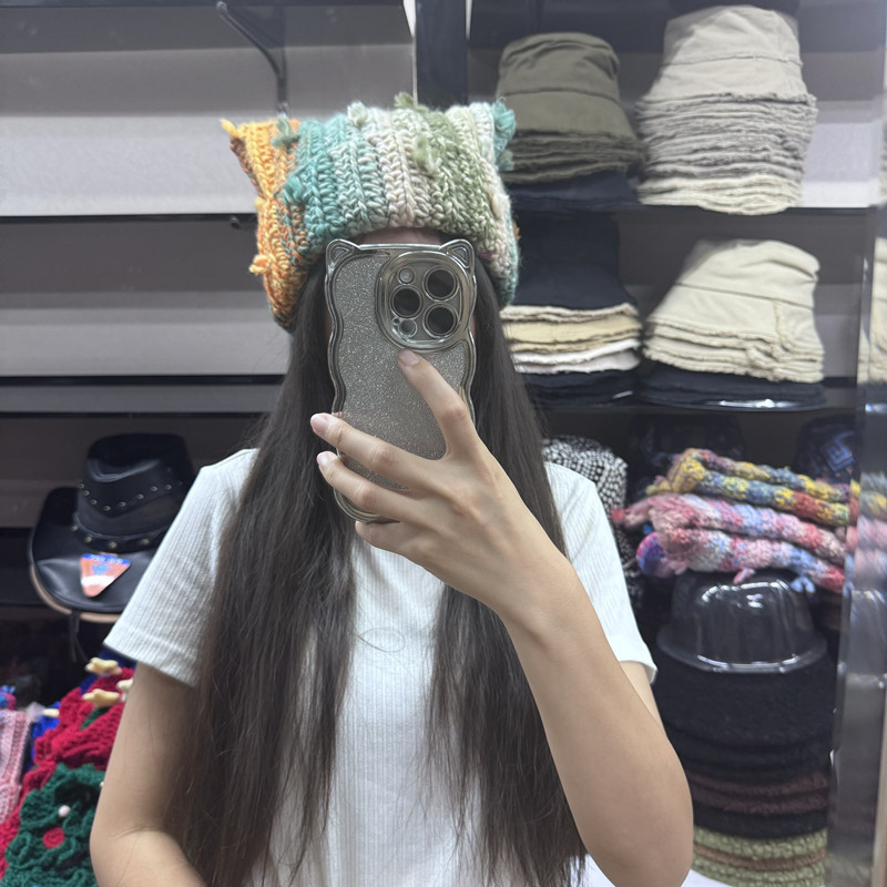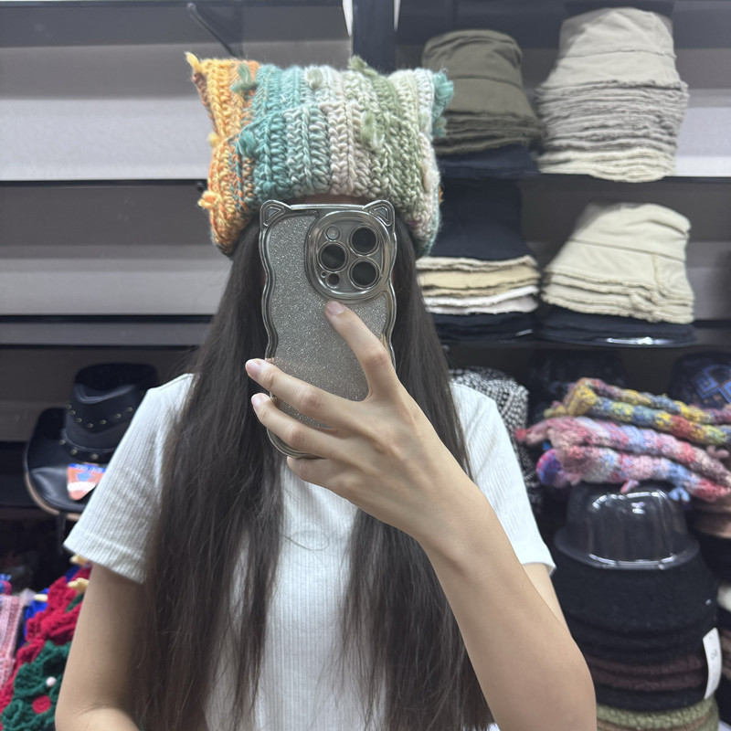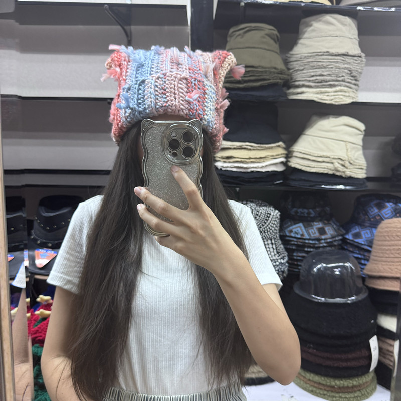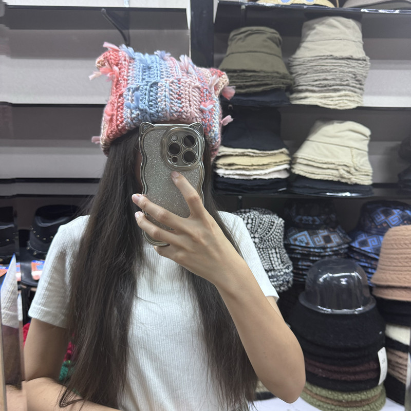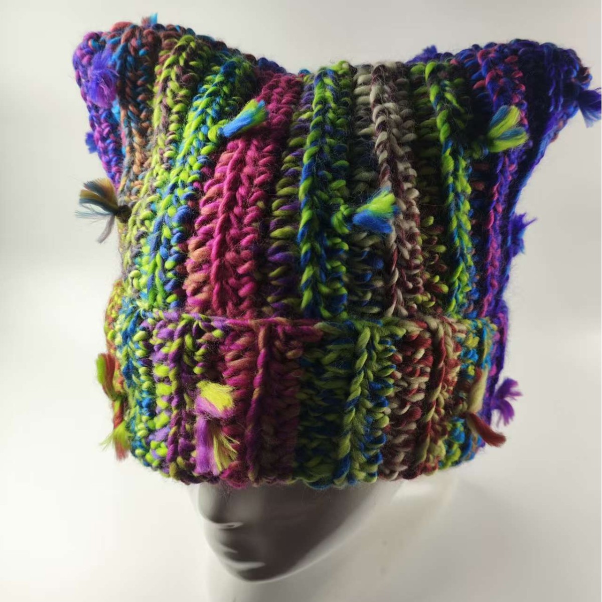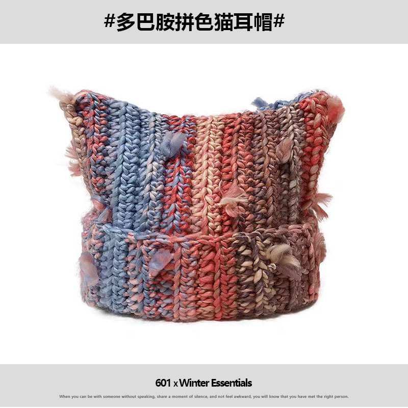 可爱撞色流苏毛线帽男女个性小众猫耳粗毛线保暖针织冷帽
