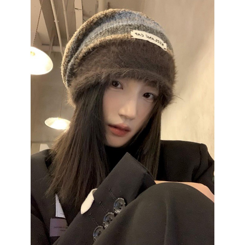 新款彩色条纹针织毛线帽女秋冬保暖百搭时尚显脸小套头帽子潮韩日
