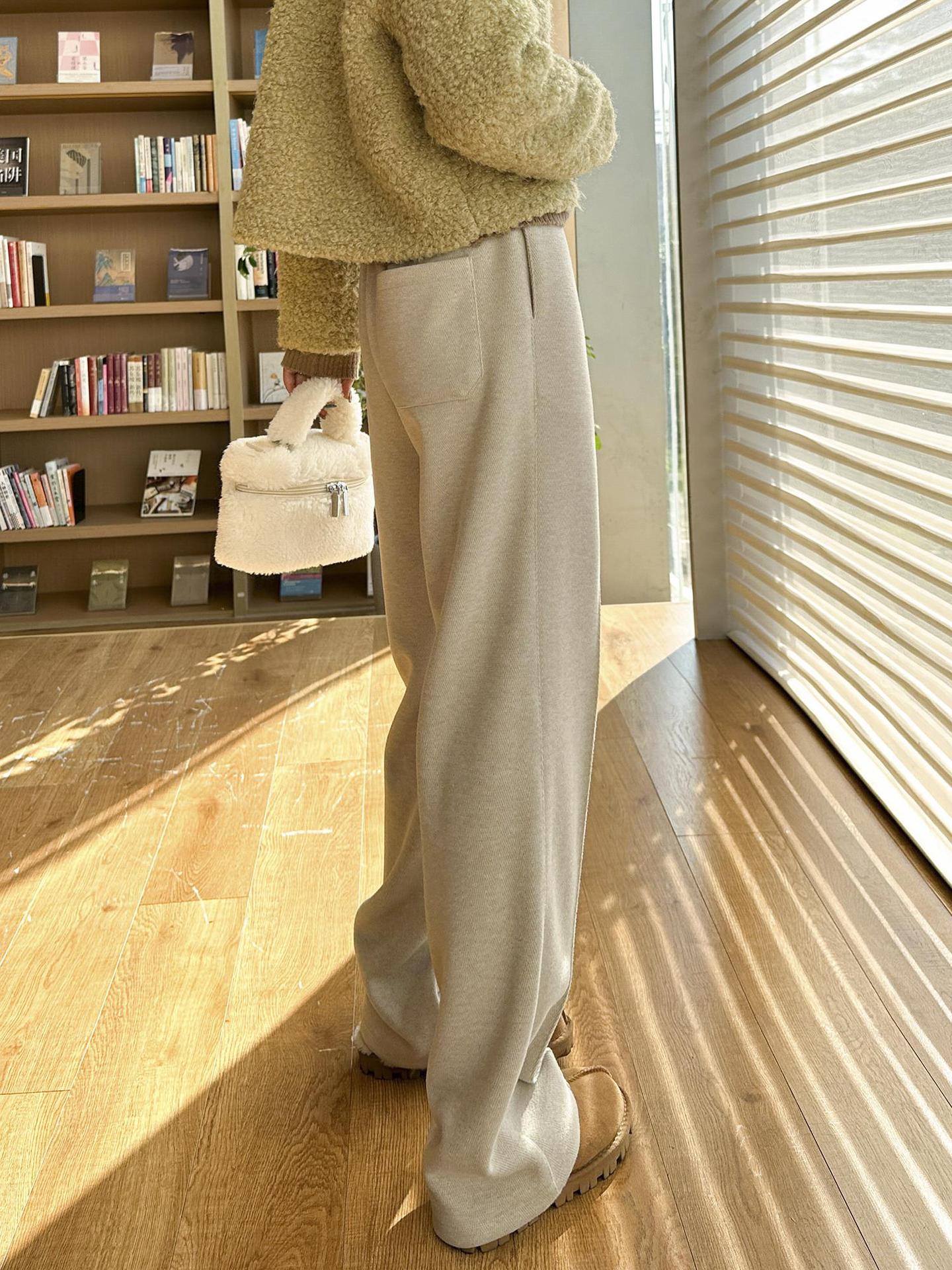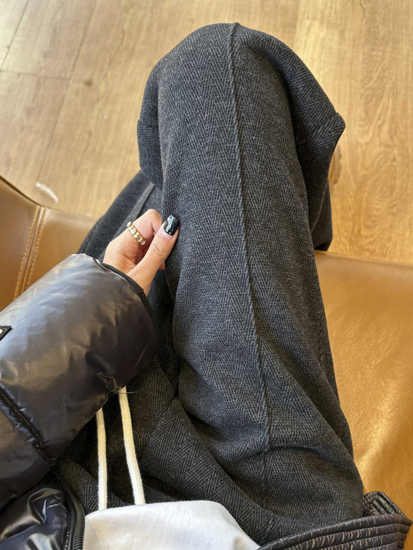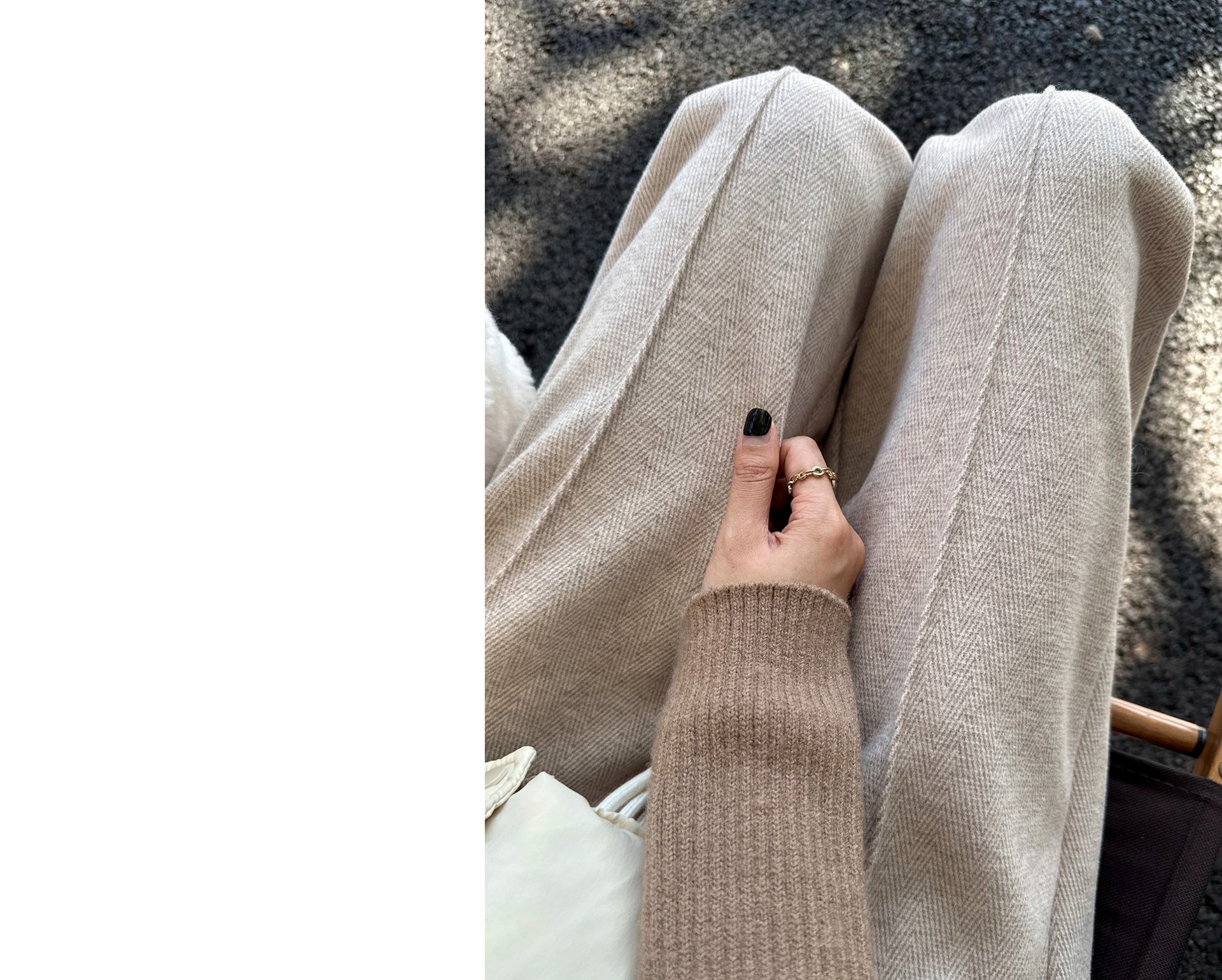 人字模様の裏起毛ワイドパンツ レディース 春秋冬 細身ストレート スリット入りウール混ニットパンツ 厚手フェイクウールニットパンツ