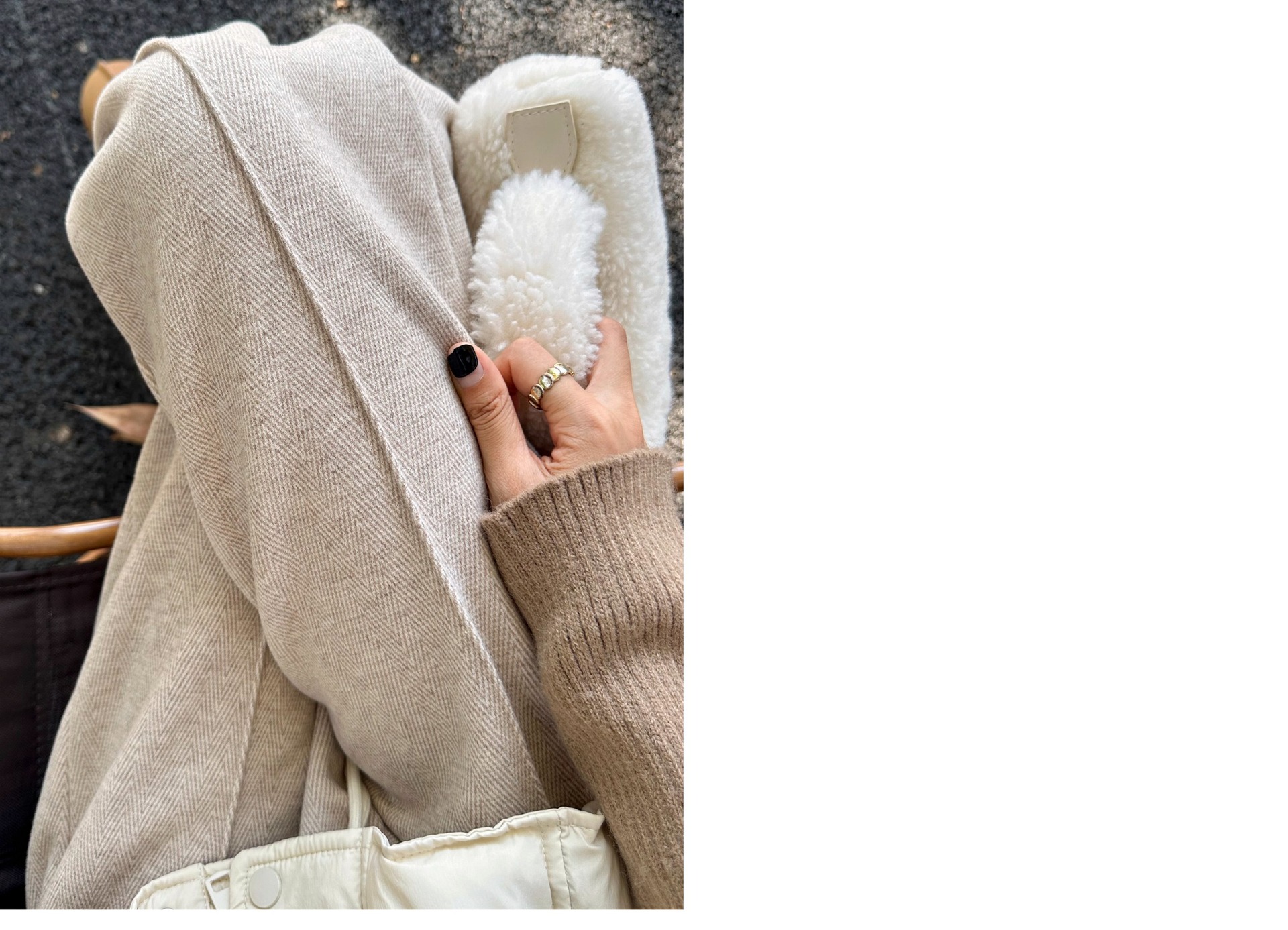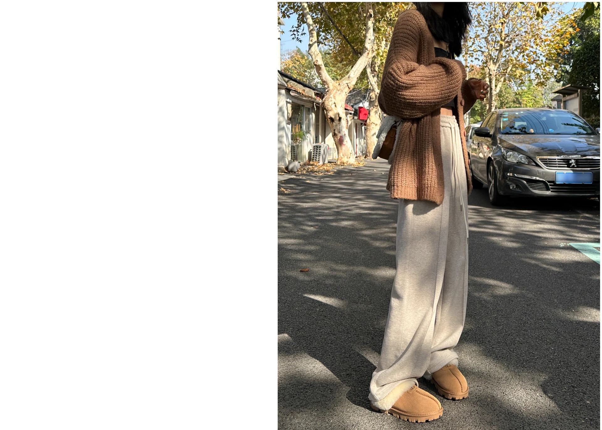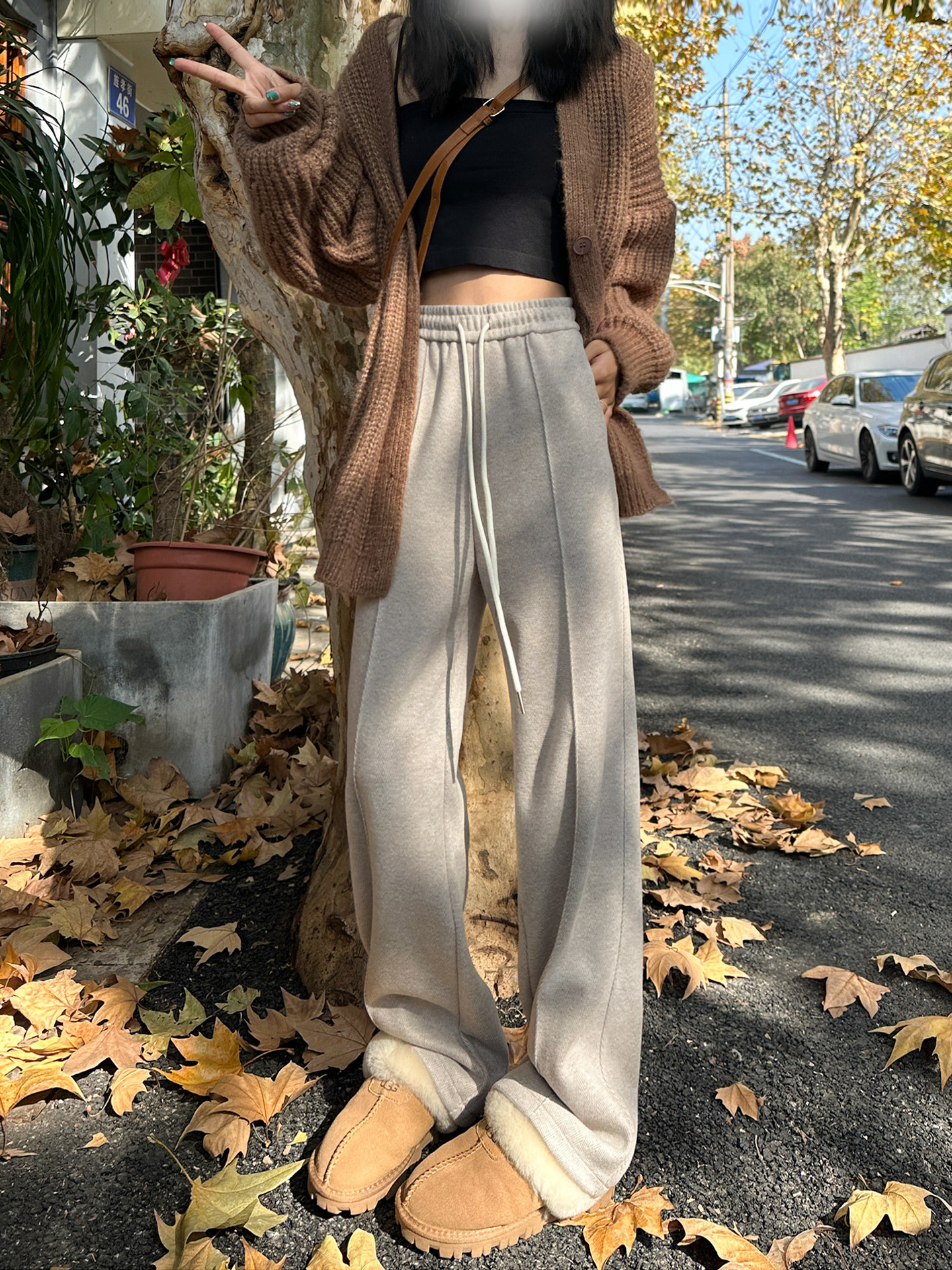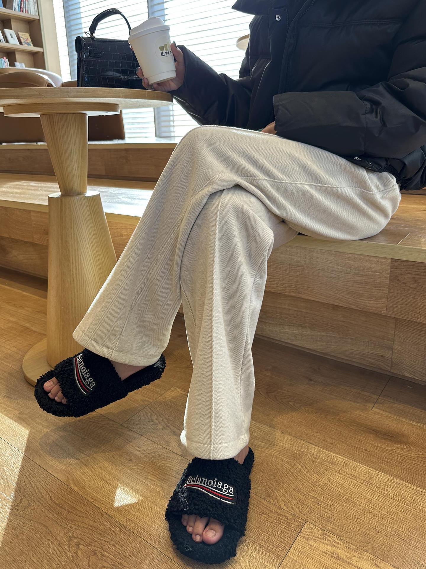 人字模様の裏起毛ワイドパンツ レディース 春秋冬 細身ストレート スリット入りウール混ニットパンツ 厚手フェイクウールニットパンツ