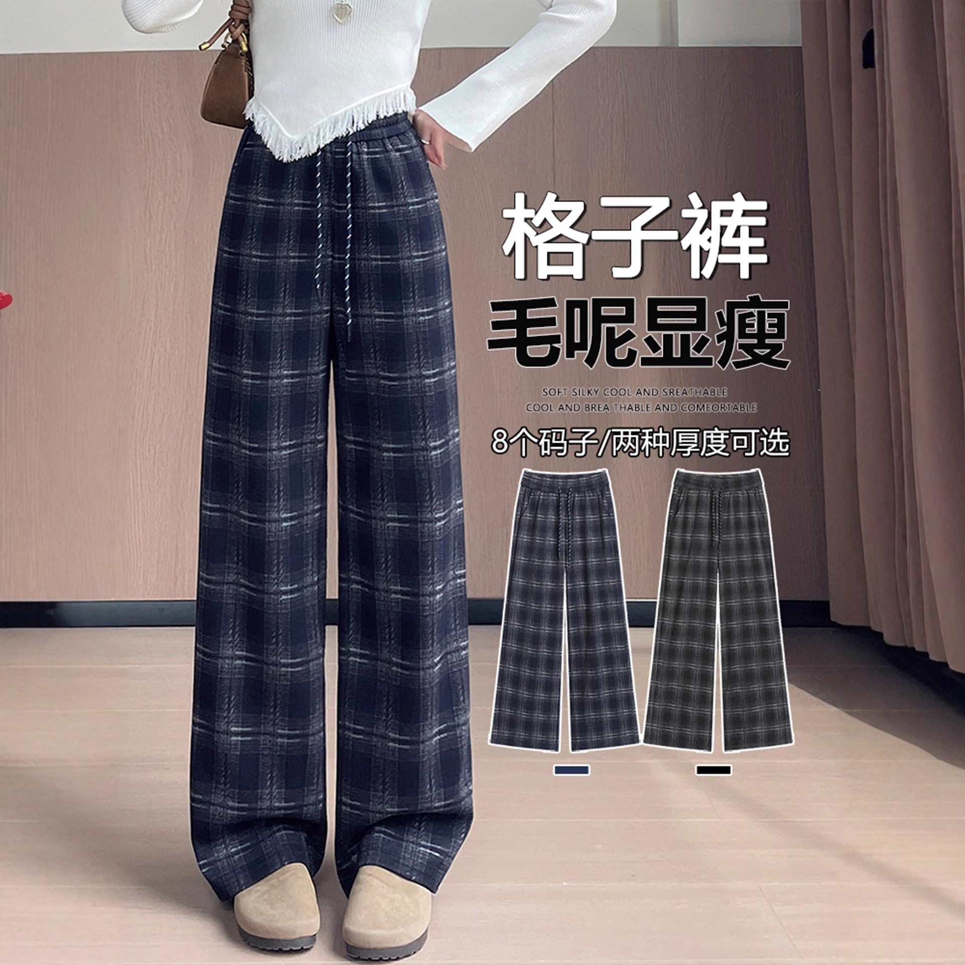 毛呢显瘦格子裤女秋冬季2025新款小个子加绒加厚高腰休闲阔腿裤子