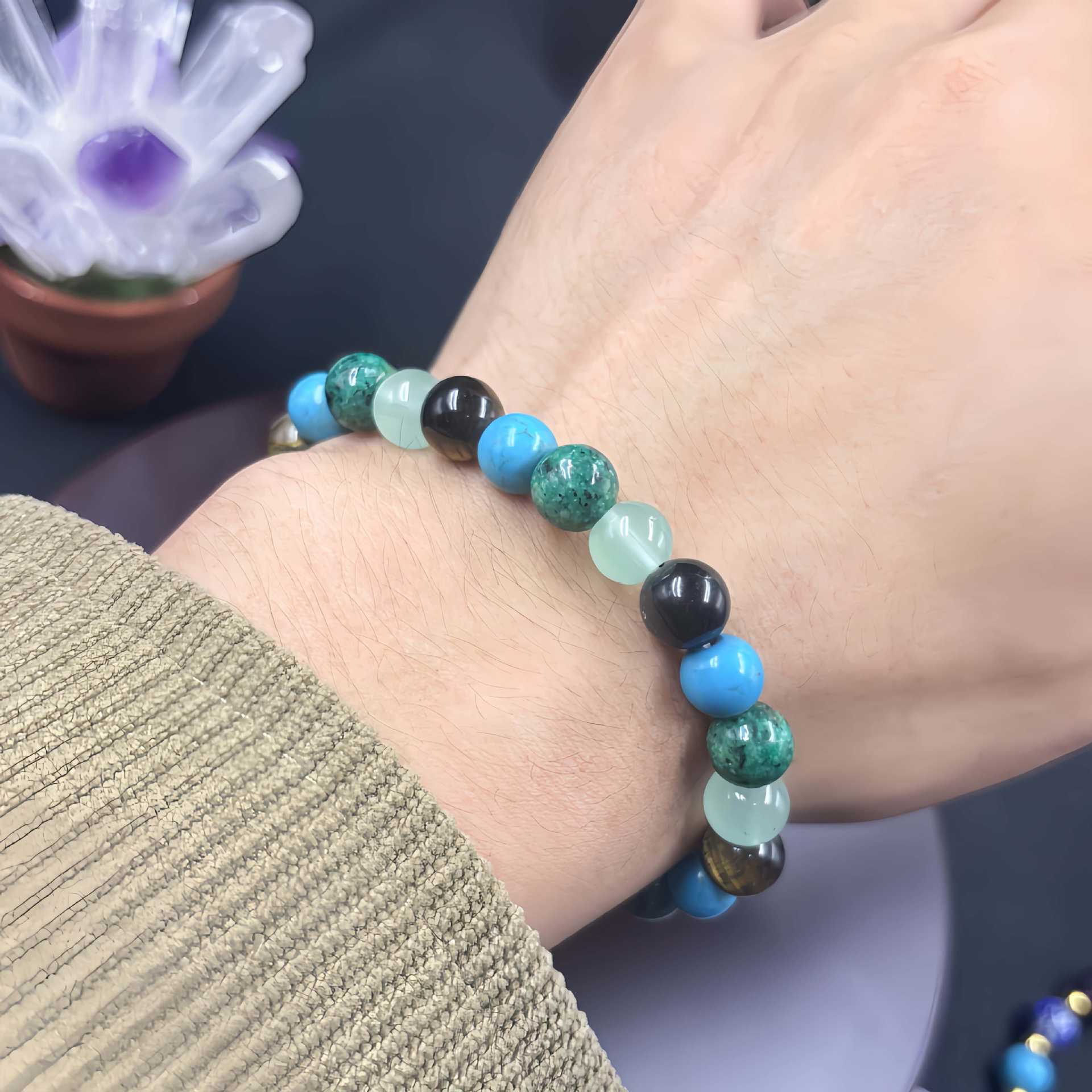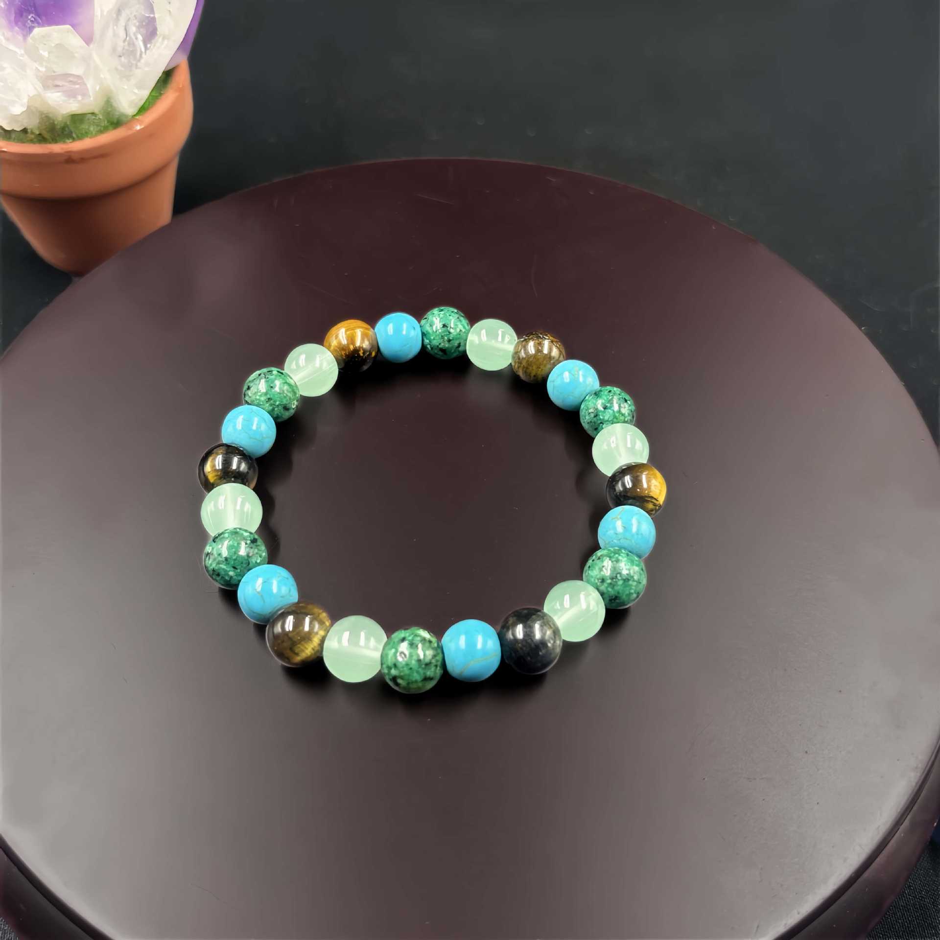 Temu希音TKクロスボーダー爆型ブレスレット虎眼石緑松石東陵緑麻石製作弾力ブレスレット卸売り