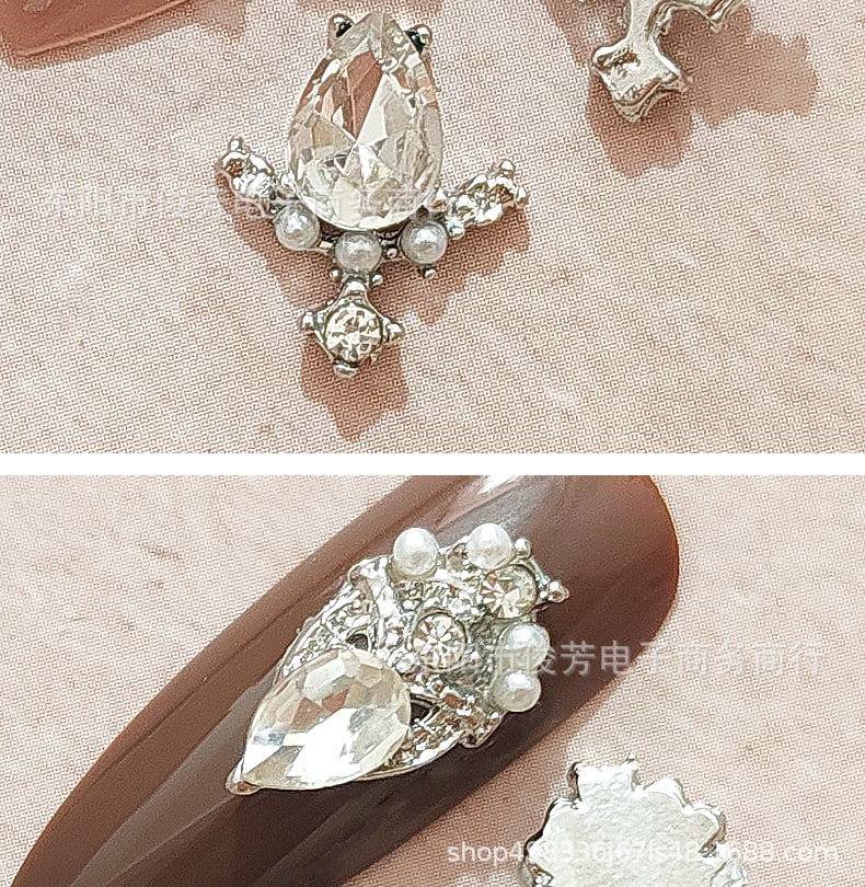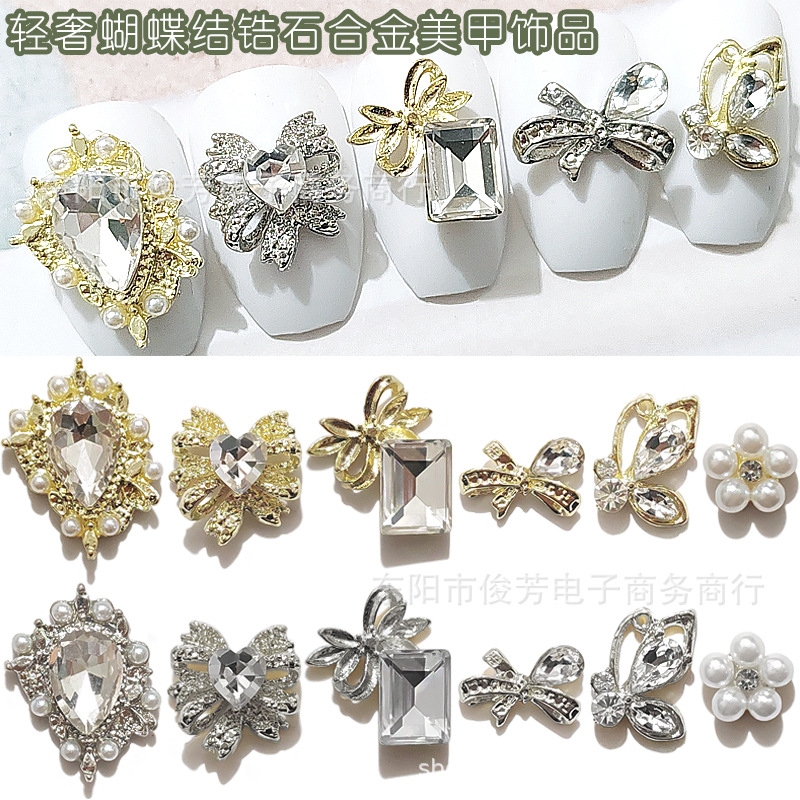 ネット赤豪華ジルコン蝶ネクタイ合金ネイルアクセサリー日系真珠大水滴花ブロック爪装飾