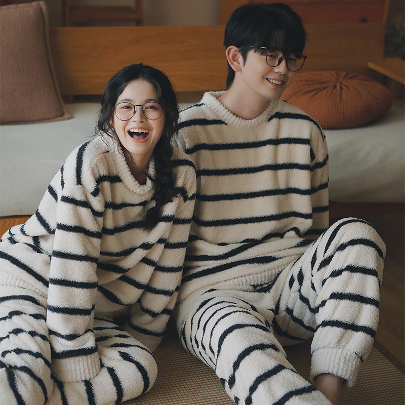 融合69-条纹情侣睡衣女款秋冬季加绒加厚半边绒可外穿家居服套装