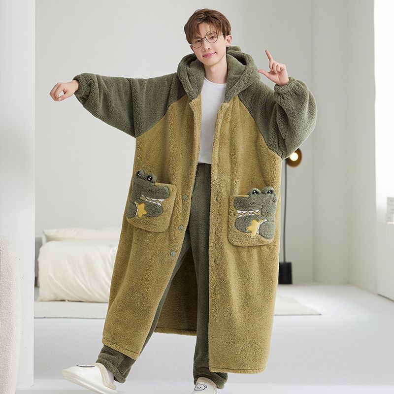 珊瑚绒睡衣男款秋冬季加厚加绒青年卡通睡袍法兰绒男士家居服套装