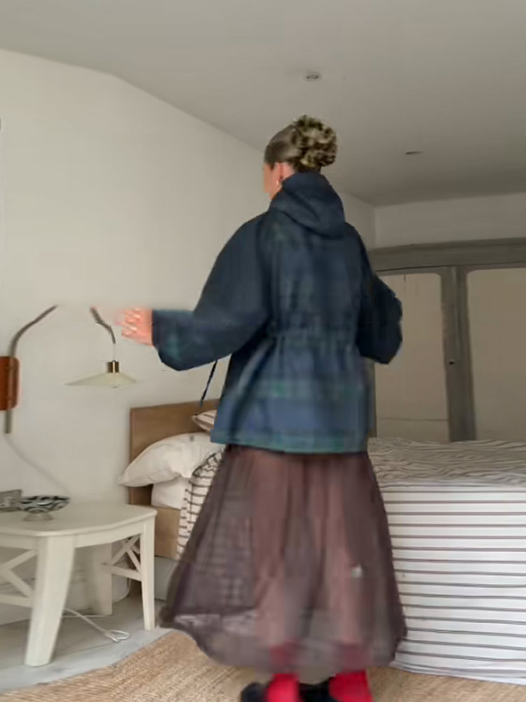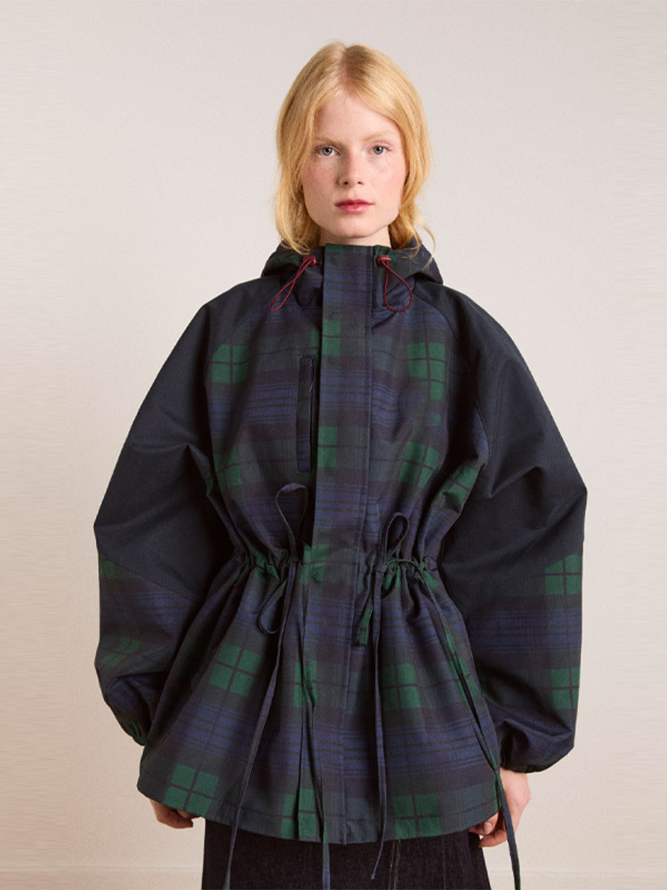 外贸欧美秋季新款女装时尚气质百搭格子拼接连帽抽绳风衣外套
