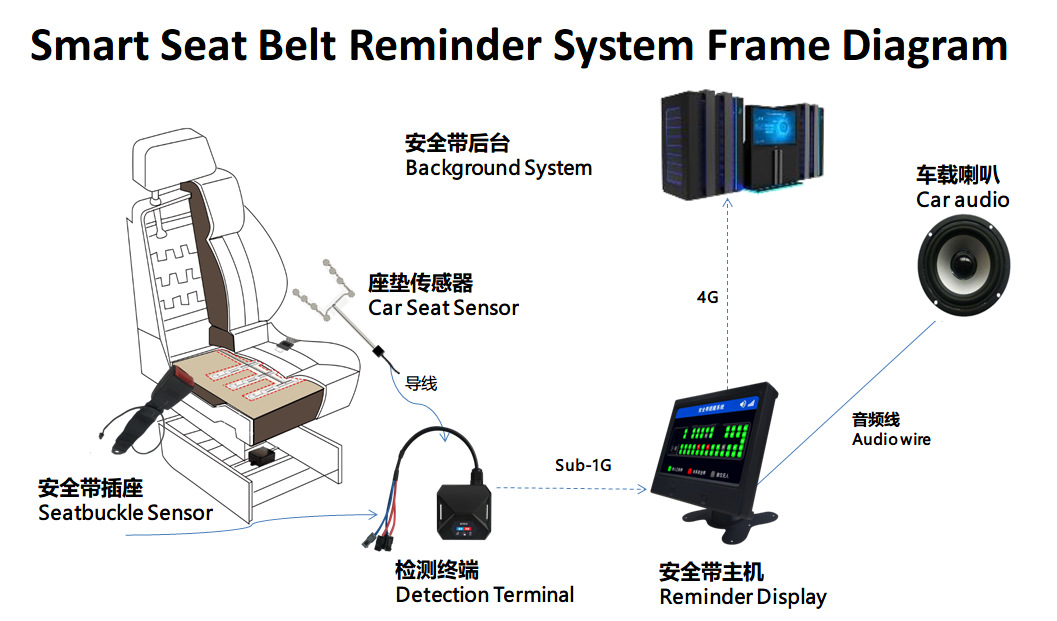 当检测到座椅上的压力时,传感器会向座椅检测终端发送信号,座椅检测终端会将信号无线传输到提醒主机、云终端。同时,它将发出声光提醒,通知乘客系好安全带。