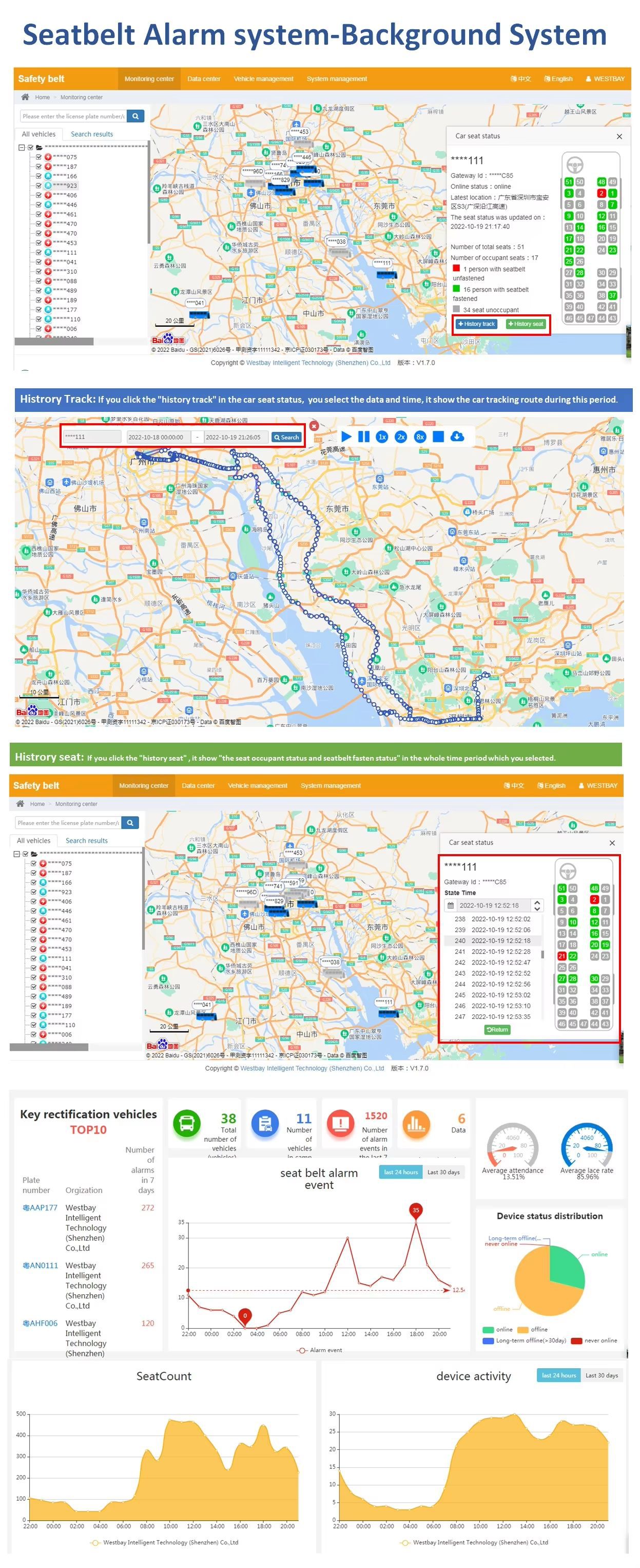 2.可以实时远程监控哪辆车,哪些乘客未系安全带,并发出报警提示。