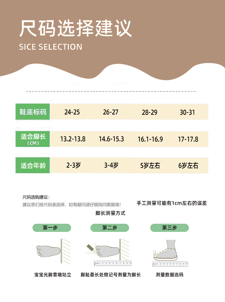 サイズ 24/25 足の長さ 13.2-13.8cm に適しています。,26/27 足の長さ14.6-15.3cmに適しています。,28/29 足の長さ16.1-16.9cmに適しています。,30/31 足の長さ17-17.8cmに適しています。