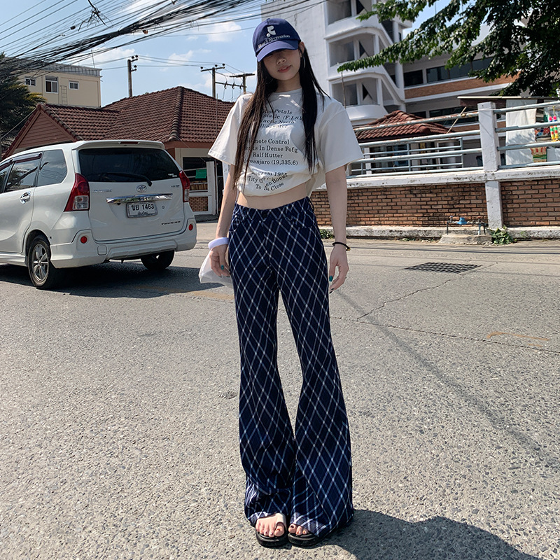 アメリカのレトロな格子縞の小さいラッパのカジュアルなズボンの女性の2025年の春の新型の高い腰はやせています。