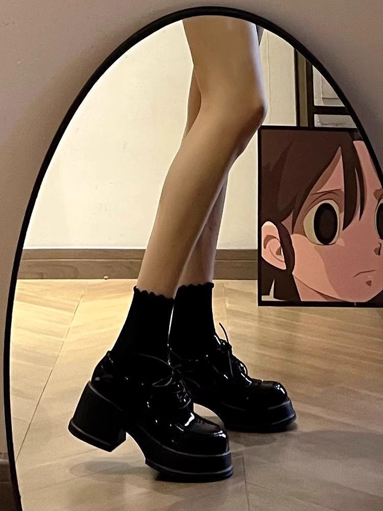 黒い厚い底の小さい靴の女性は秋に高くなります。