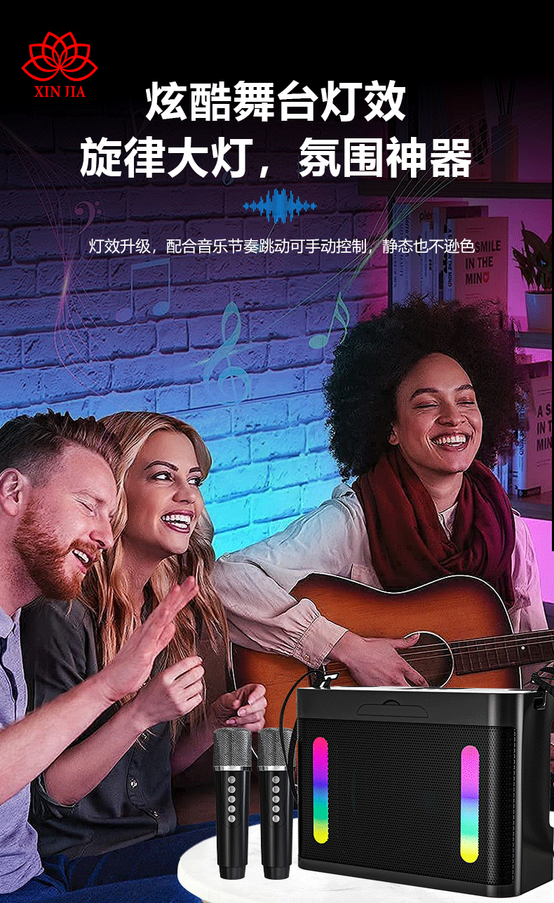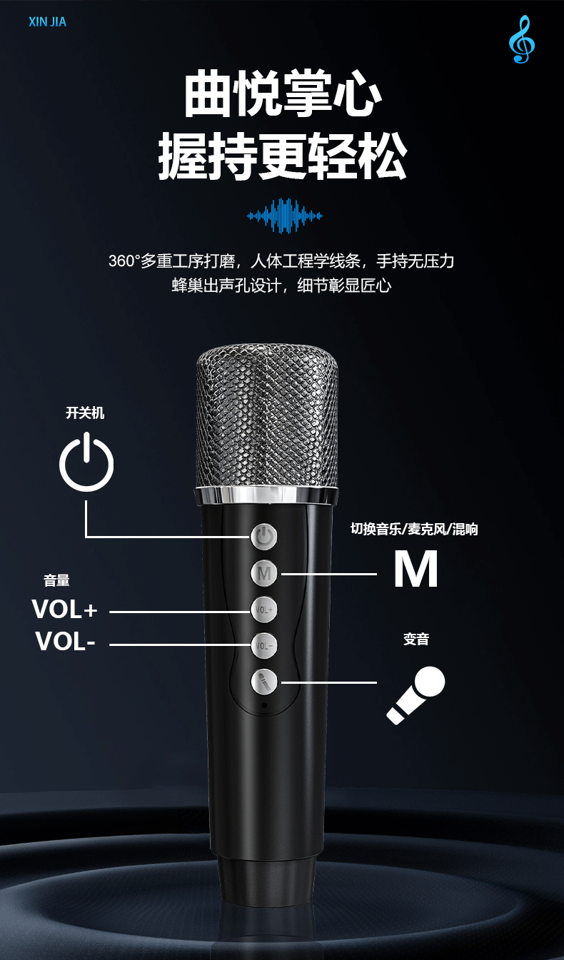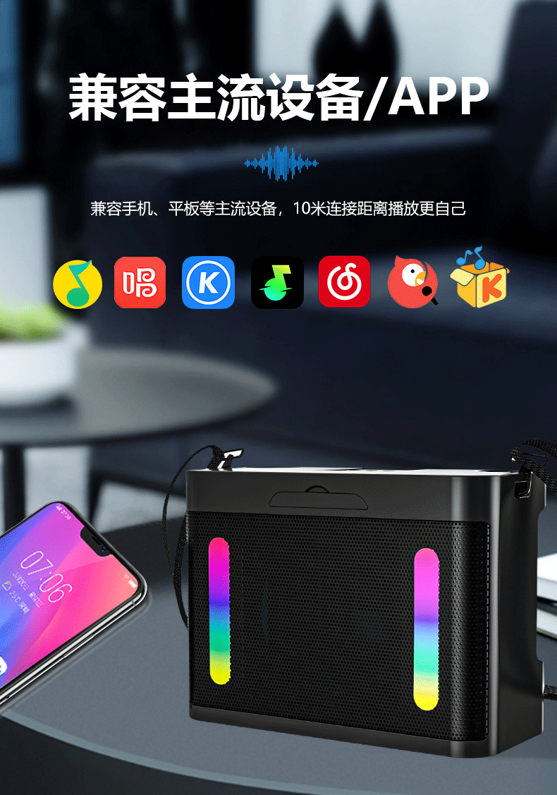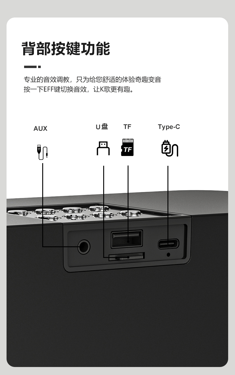 产品功能: 蓝牙、TF卡、 USB 、AUX 、 K歌、变音、魔音、消原音