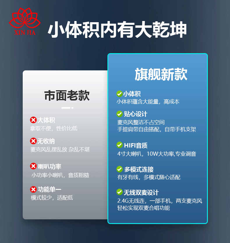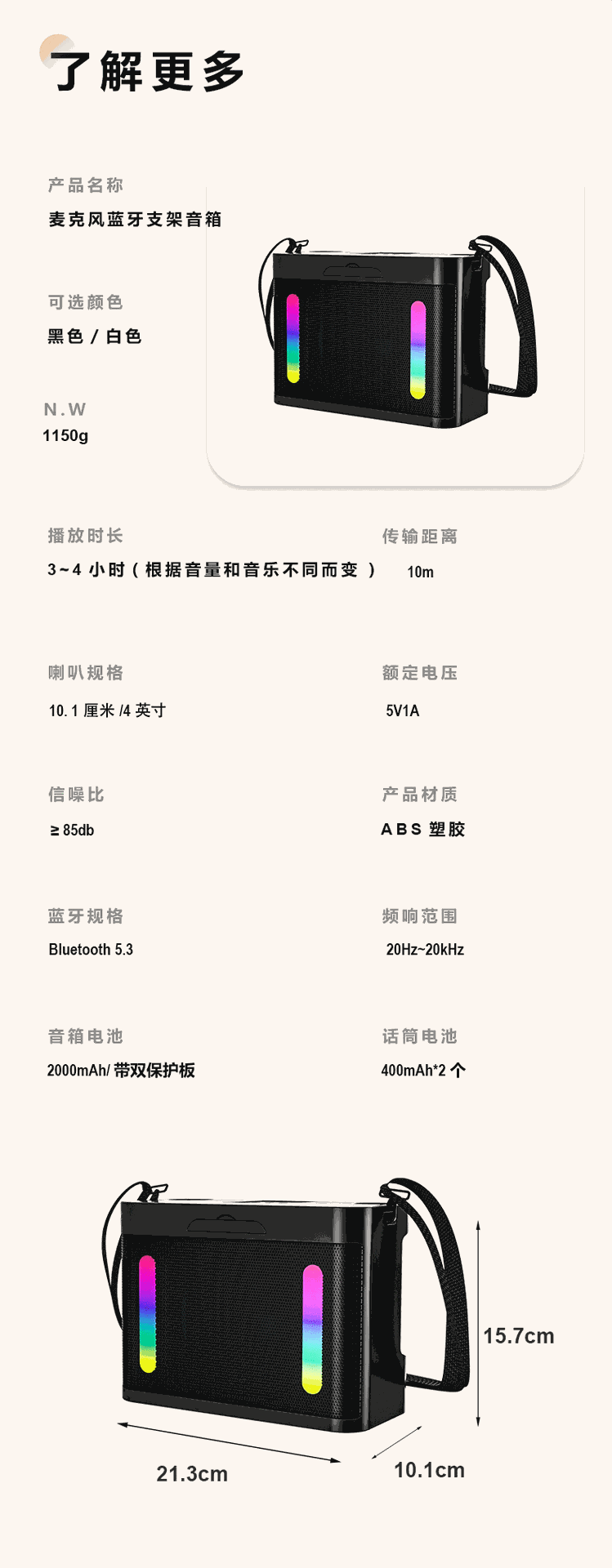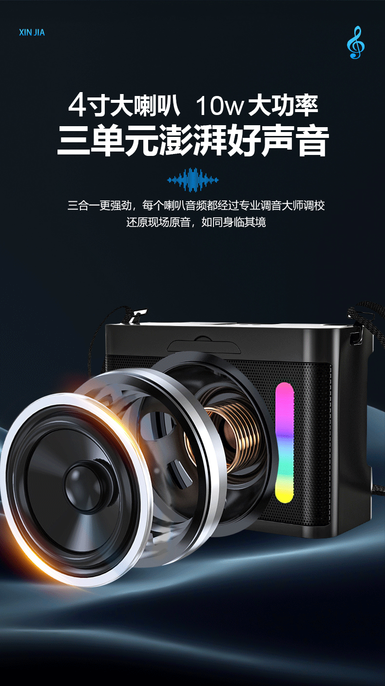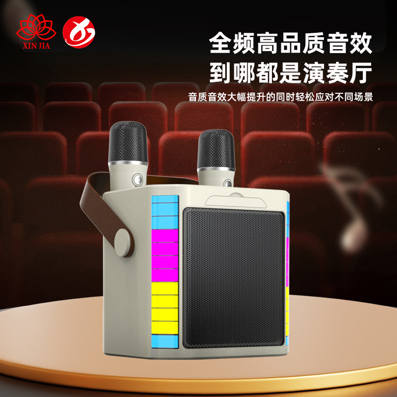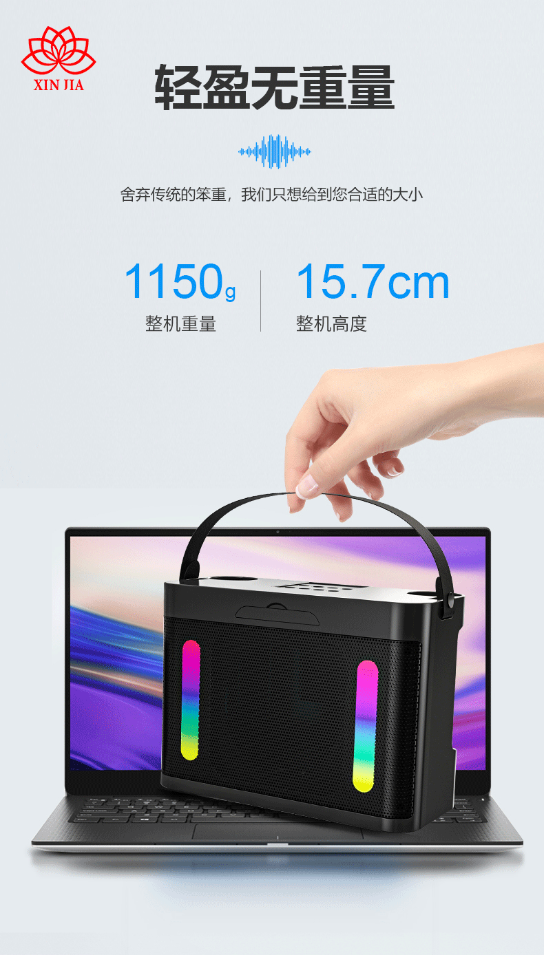 产品功能: 蓝牙、TF卡、 USB 、AUX 、 K歌、变音、魔音、消原音