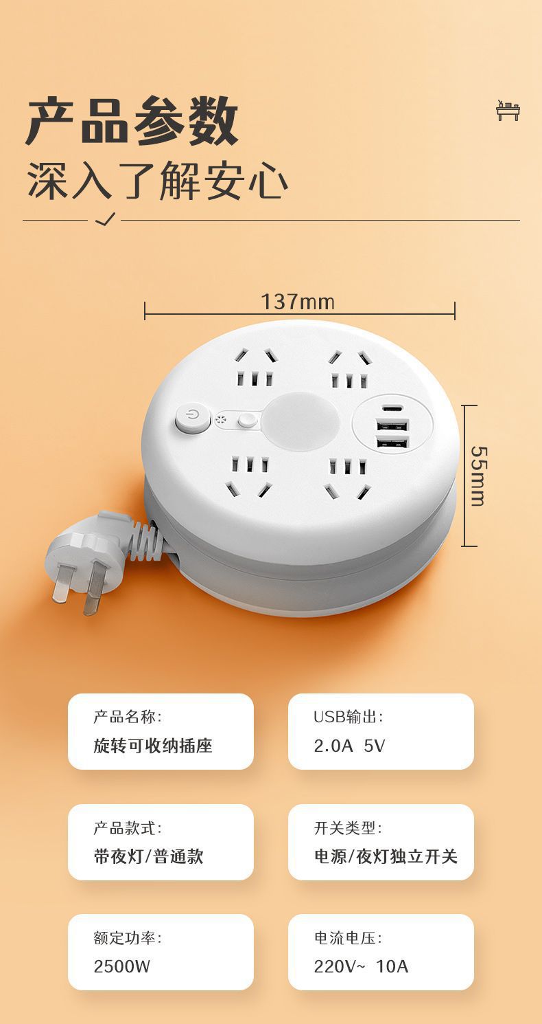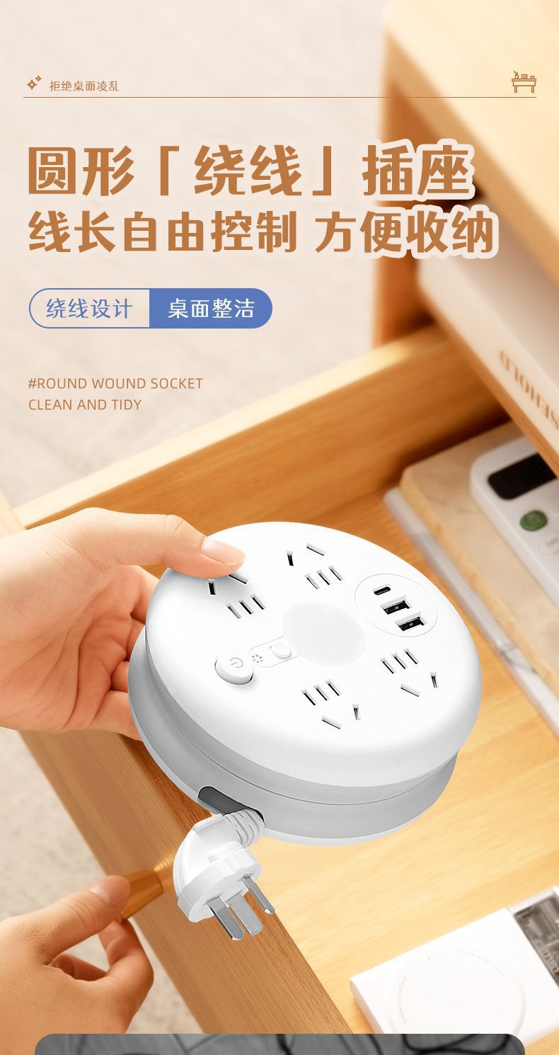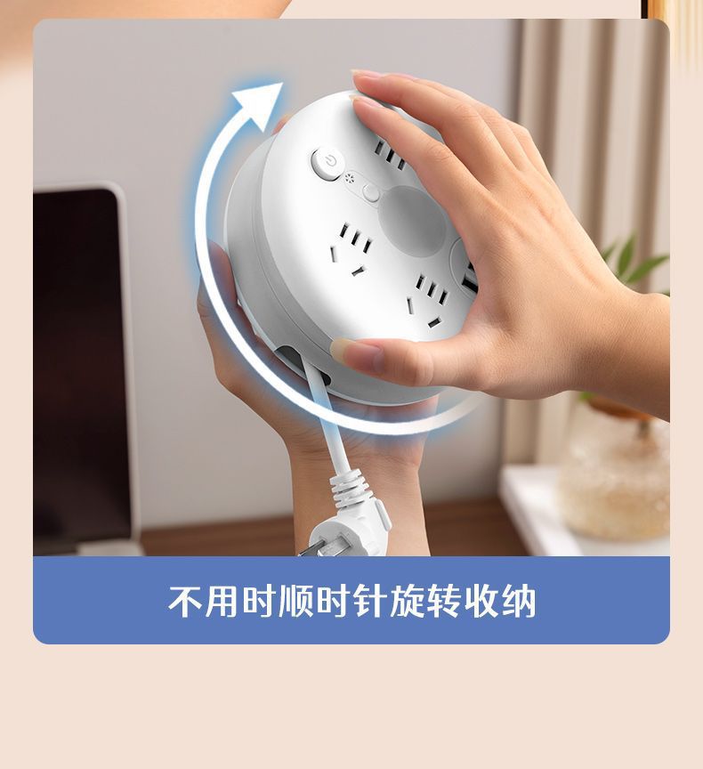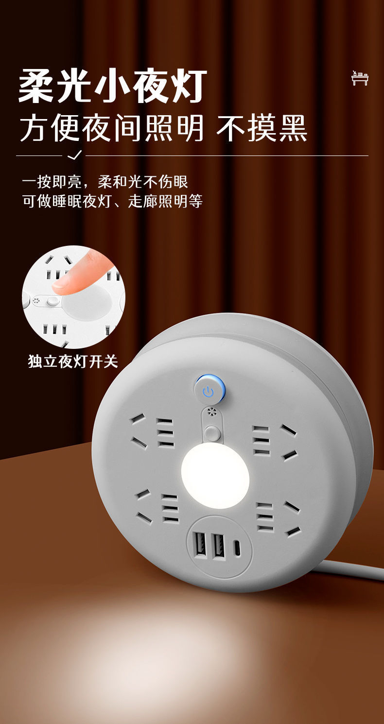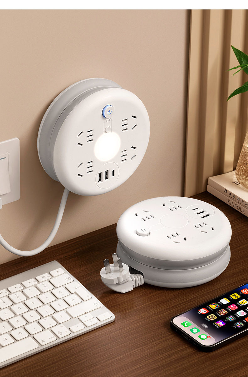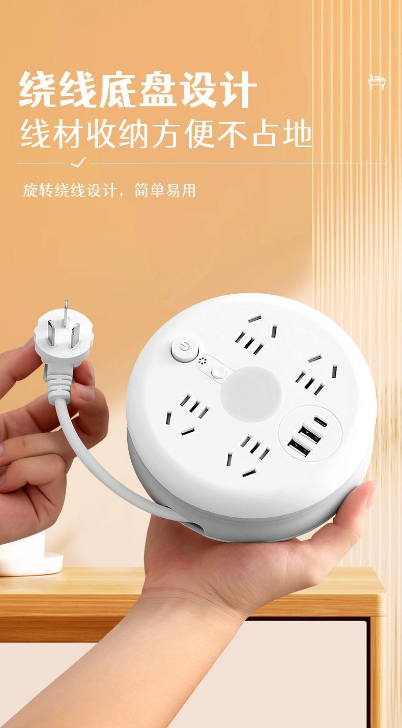 圆形可收纳伸缩排插usb接线板家用宿舍转换器插座带夜灯排插线板